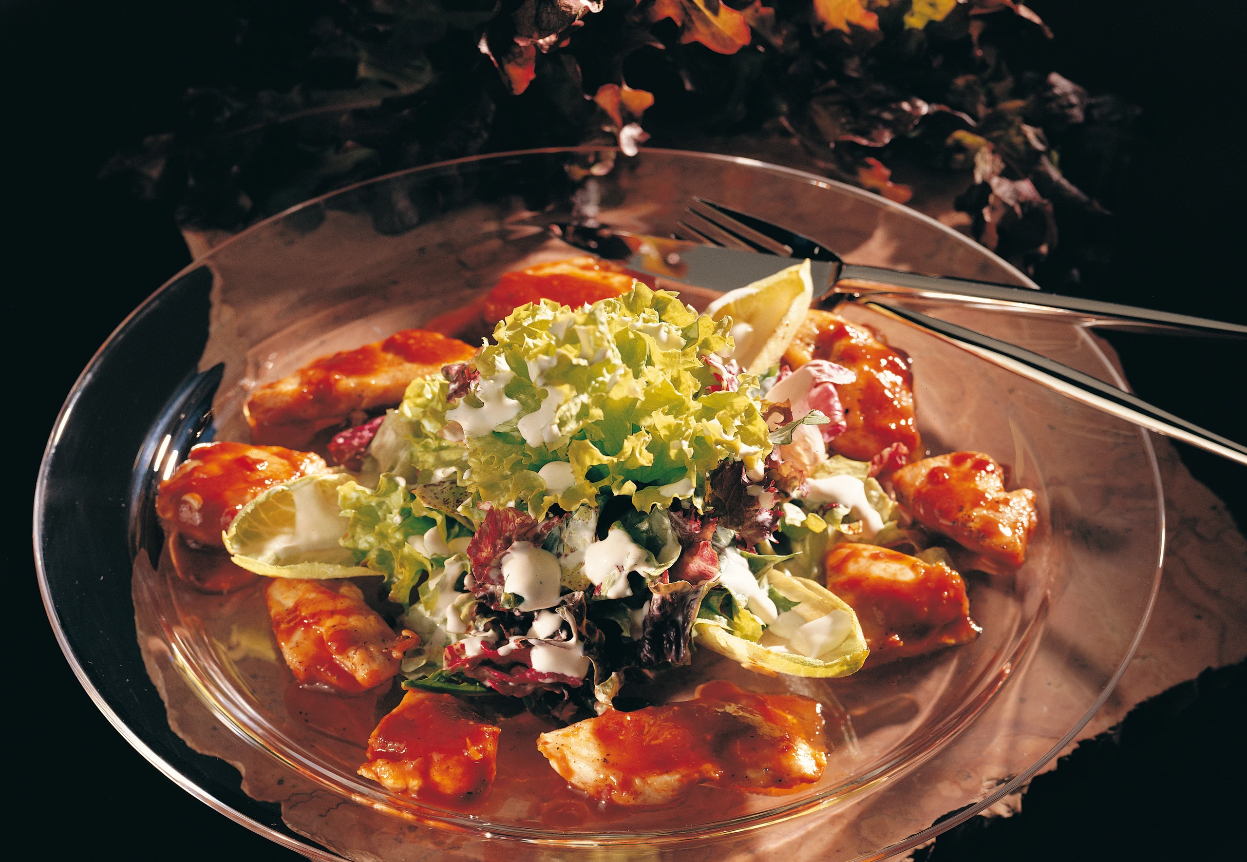 Salate in eine Schüssel geben, mit dem Knoblauchrahm beträufeln, behutsam vermischen und mit dem Hühnerfleisch auf Tellern anrichten. Dazu passen Sesamweckerln.