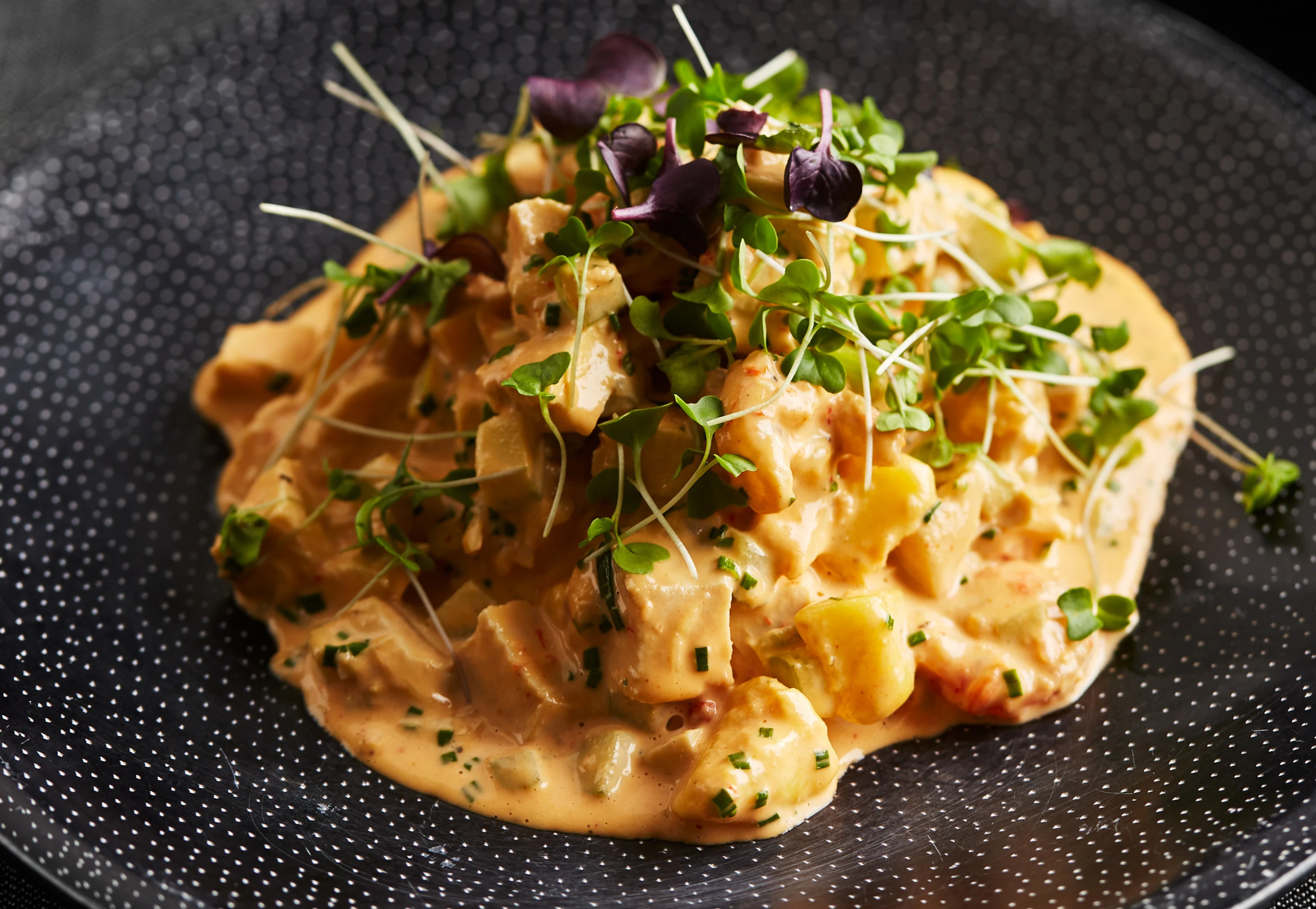Hühnerfleisch, Shrimps, Sellerie, Mango und Schnittlauch unterrühren. Salat mit Salz und Pfeffer würzen.