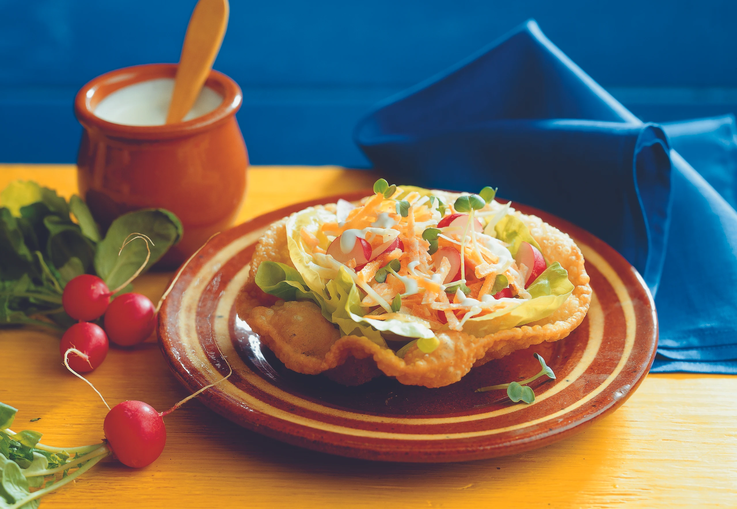 In einem Topf (Ø ca. 22 cm) 3 Finger hoch Öl erhitzen. Tortillas darin einzeln knusprig goldbraun backen, die Tortilla während des Backens mit einem Schöpfer in das Öl drücken, so dass ein Körbchen entsteht. Tortillas herausheben und auf Küchenpapier abtropfen lassen.