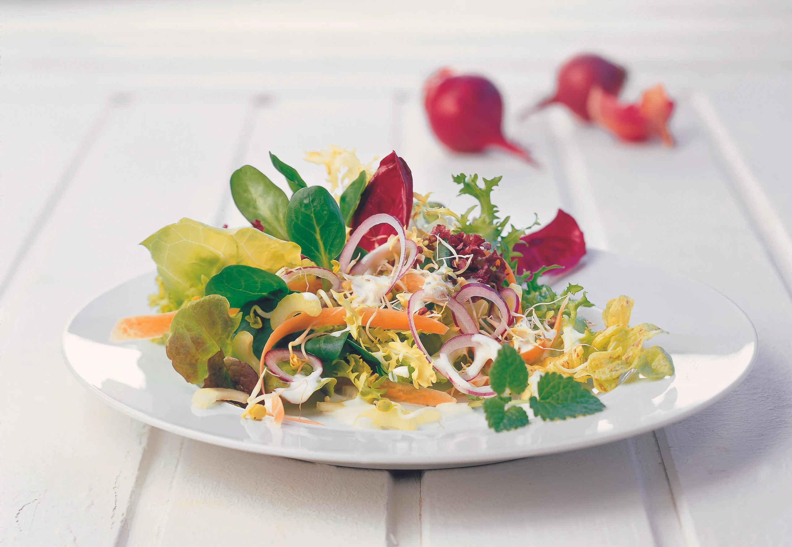 - 300 g Blattsalat (und Wildkräuter wie Rucola, Vogerlsalat, Löwenzahn, Eichblatt, Kopfsalat, Radicchio)