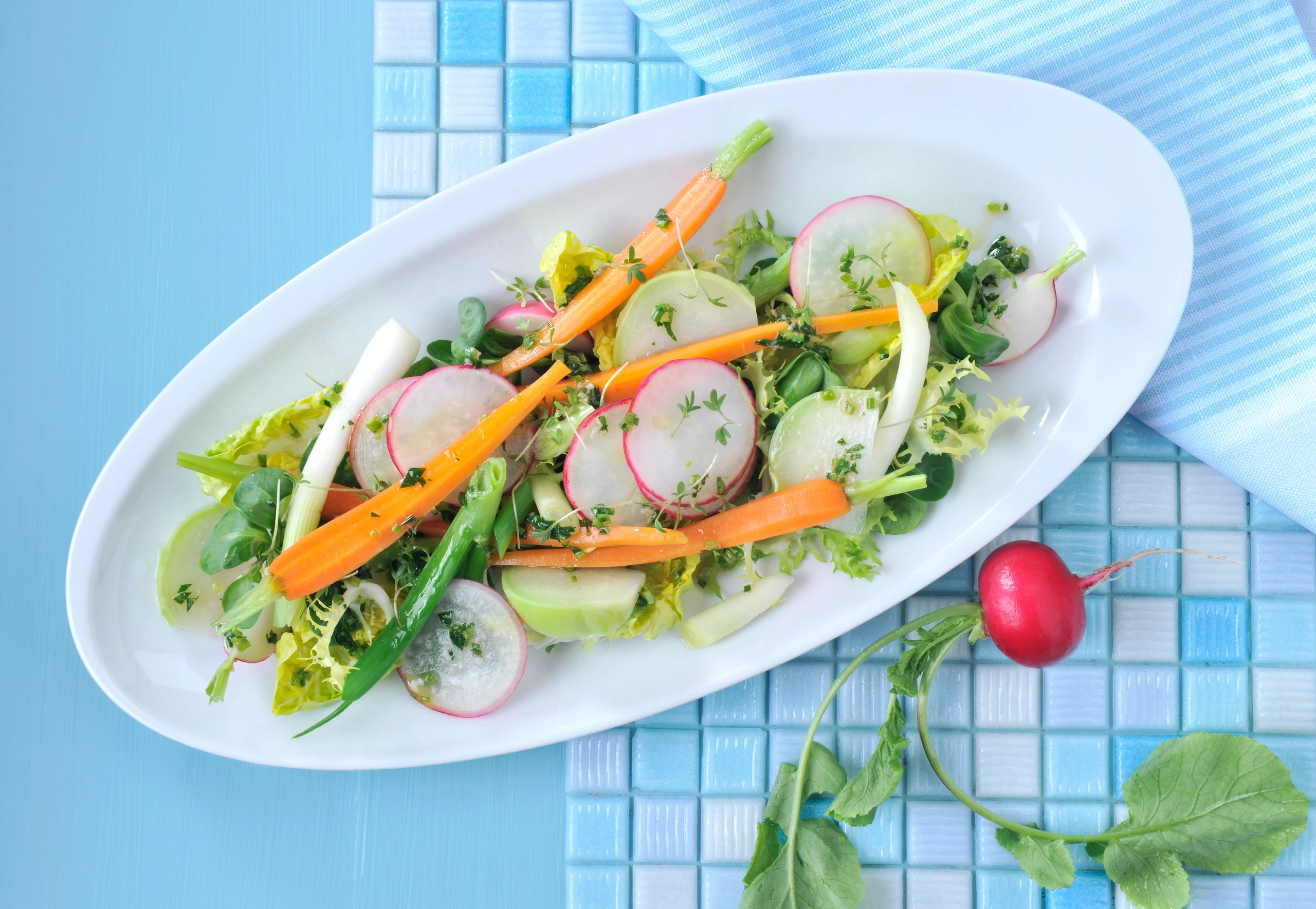 - Gemüse putzen bzw. schälen. Karotten halbieren. Kohlrabi in Spalten, Radieschen in dünne Scheiben, Jungzwiebeln in Stücke schneiden. Schnittlauch in Röllchen schneiden.