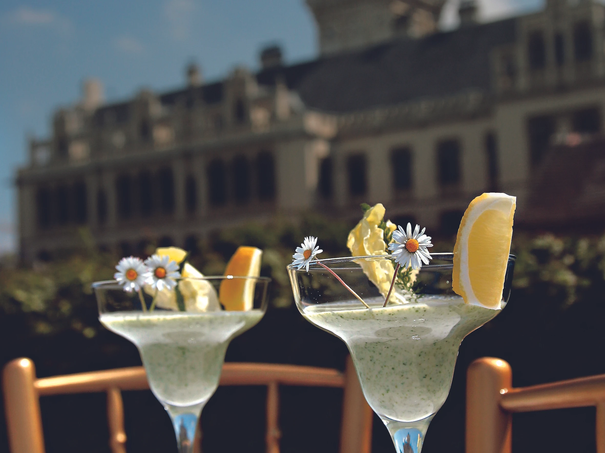 Für die Garnitur Zitrone in vier Spalten schneiden. Spalten zwischen Schale und Fruchtfleisch nicht zu tief einschneiden und auf die Gläser stecken. Suppe einfüllen, mit Salat und Gänseblümchen garnieren.