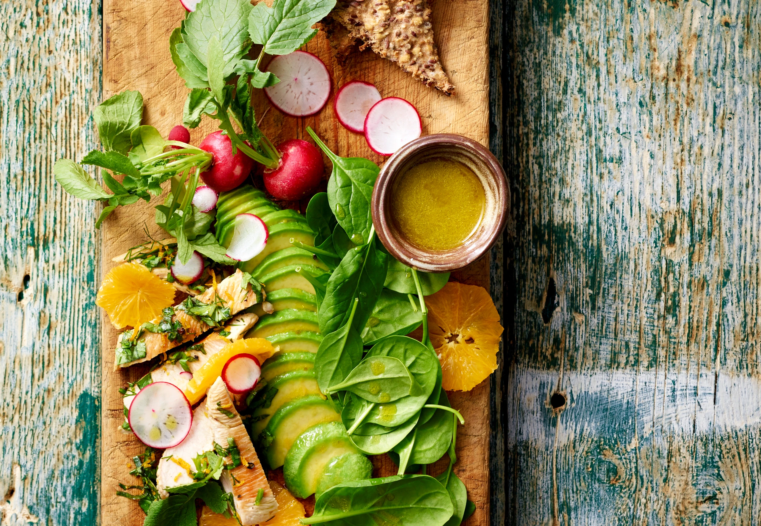 Spinat, Radieschen, Avocados und Orangenscheiben auf Tellern oder in einer Schüssel anrichten, mit dem Dressing beträufeln. Hühnerfilets in Streifen schneiden und auf den Salat legen.