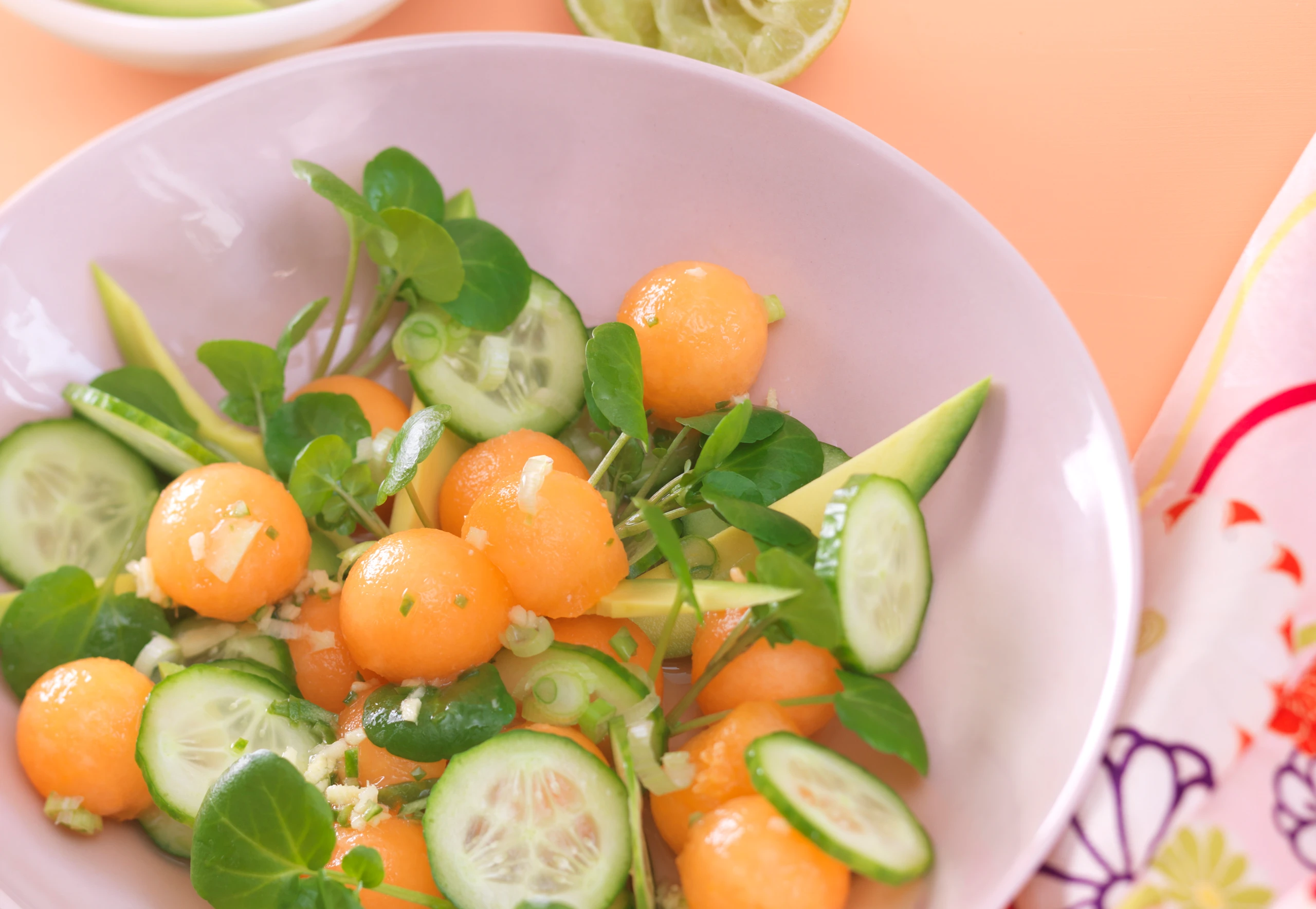 Brunnenkresse und Gemüse putzen. Melone schälen, aus dem Fruchtfleisch Kugeln ausstechen oder Fruchtfleisch würfelig schneiden. Gurken in dünne Scheiben, Jungzwiebeln in dünne Ringe schneiden.