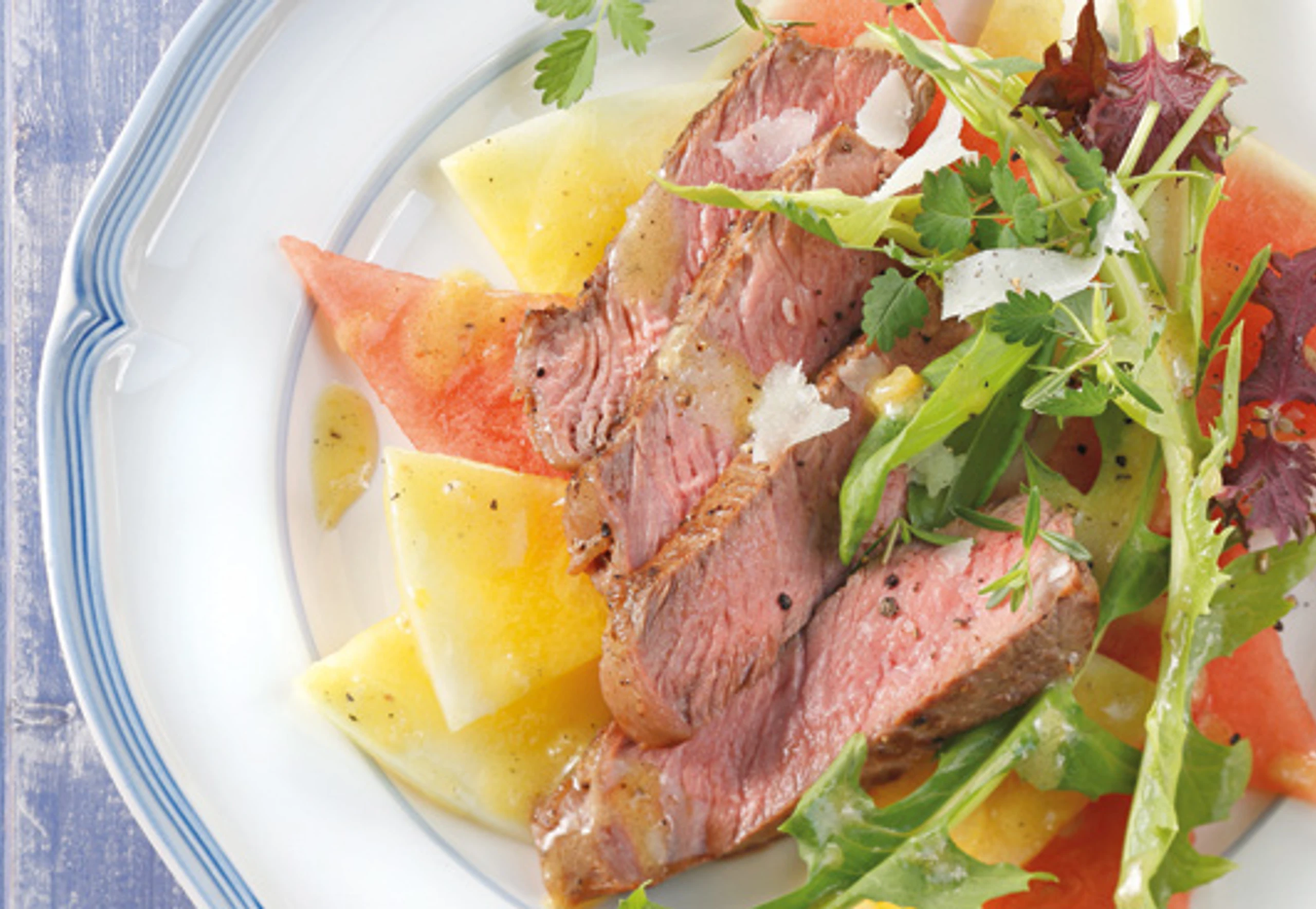 - Beiried quer zur Faser in 1 cm dicke Scheiben schneiden, mit Löwenzahn und Kräutern auf den Melonen anrichten. Mit Dressing beträufeln und mit Käsespänen bestreuen.