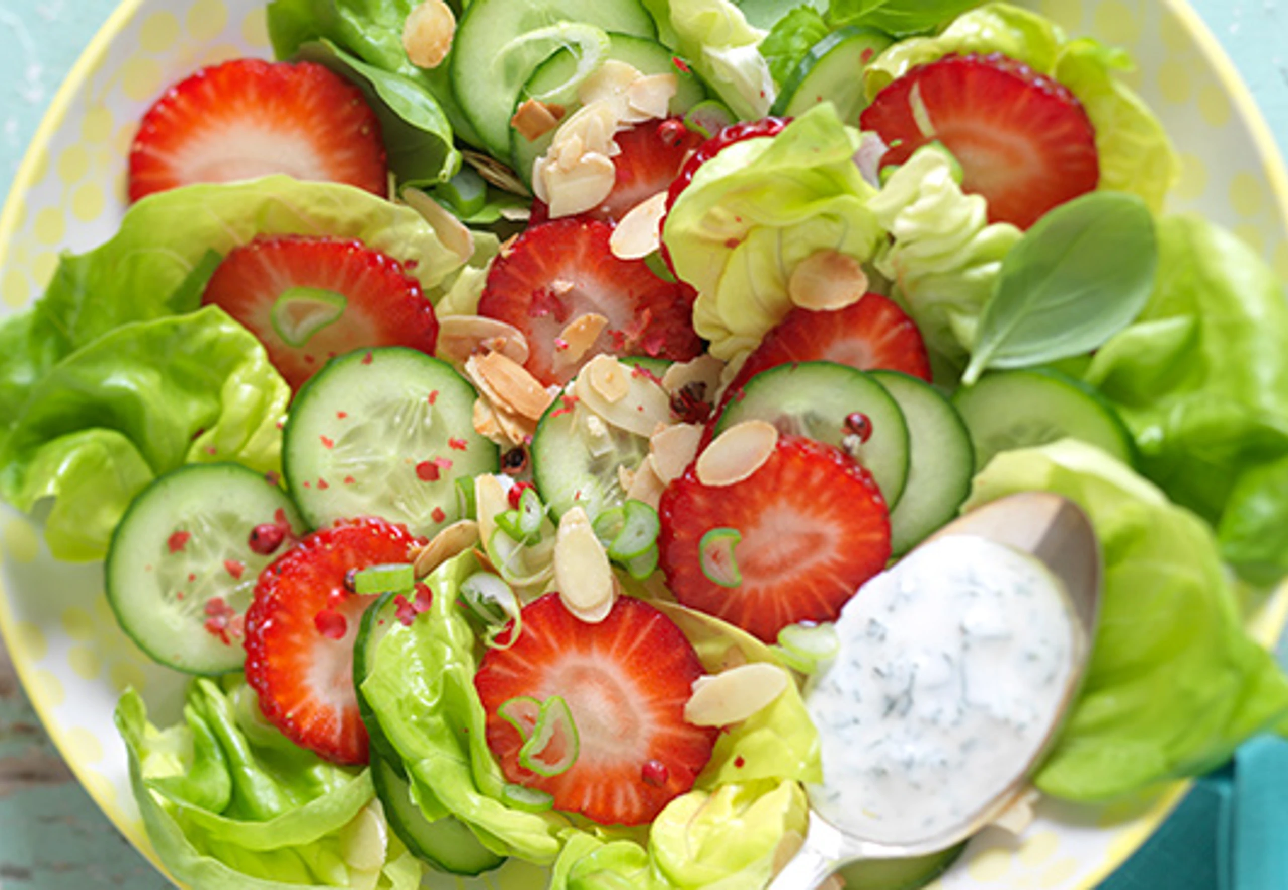 Salat mit Erdbeeren, Gurken und Basilikumdressing
