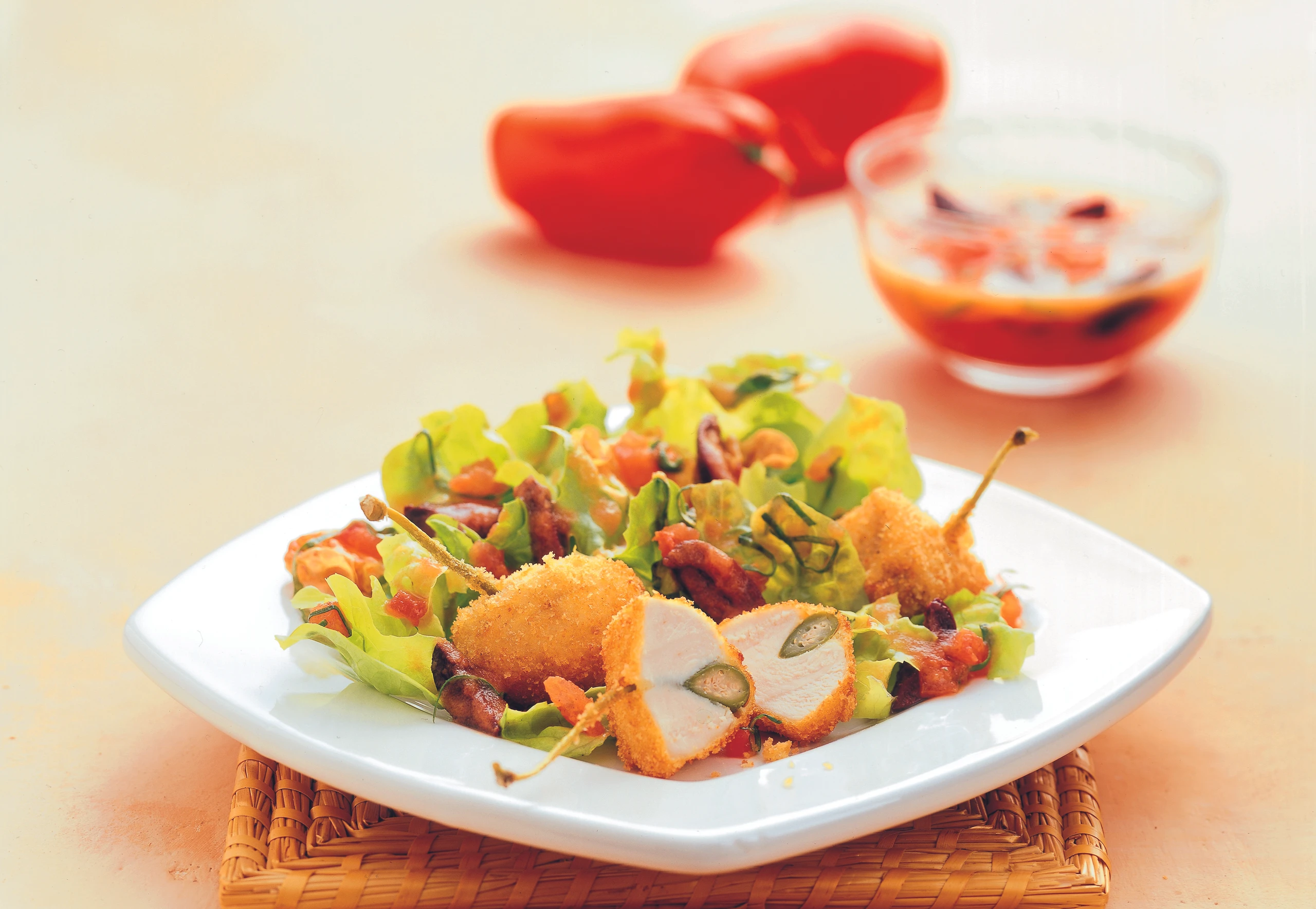 Salat putzen, waschen und trockenschleudern. Kaninchenrückenfilets in je 3 Medaillons schneiden, etwas flach drücken, mit einem Metallspieß durchstechen und die Kapernbeeren mit dem Stiel durch das Loch ziehen.