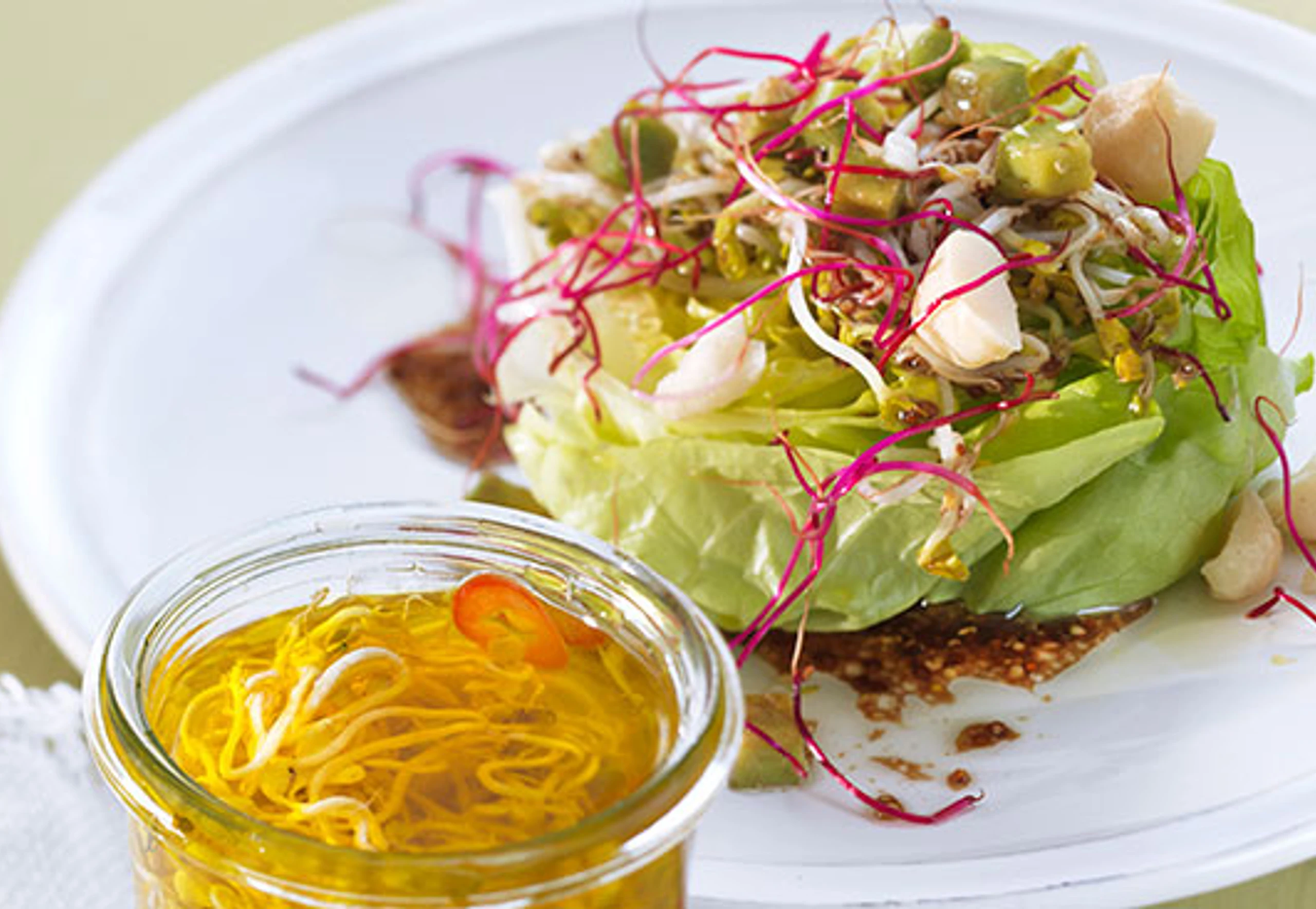 - Avocado und Sprossen in restlichem Öl kurz erhitzen, vom Herd nehmen, mit Marinade ablöschen und über den Salat gießen. Salat mit Nüssen bestreuen.