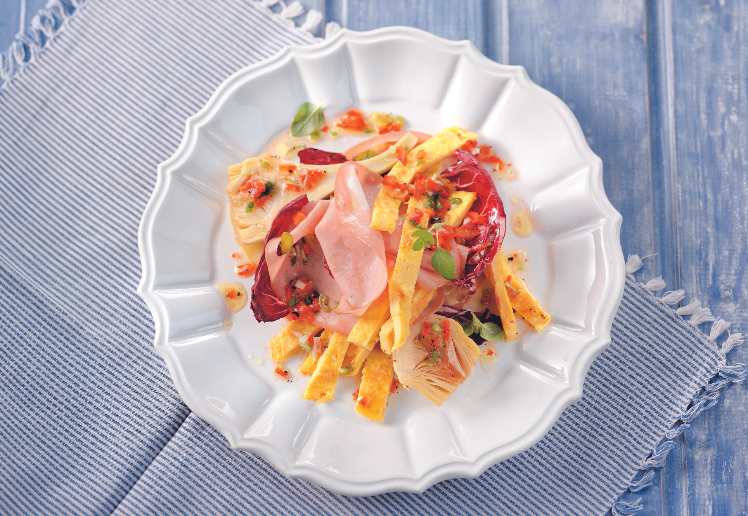 Salat mit Omelette Streifen, Radicchio und Mortadella