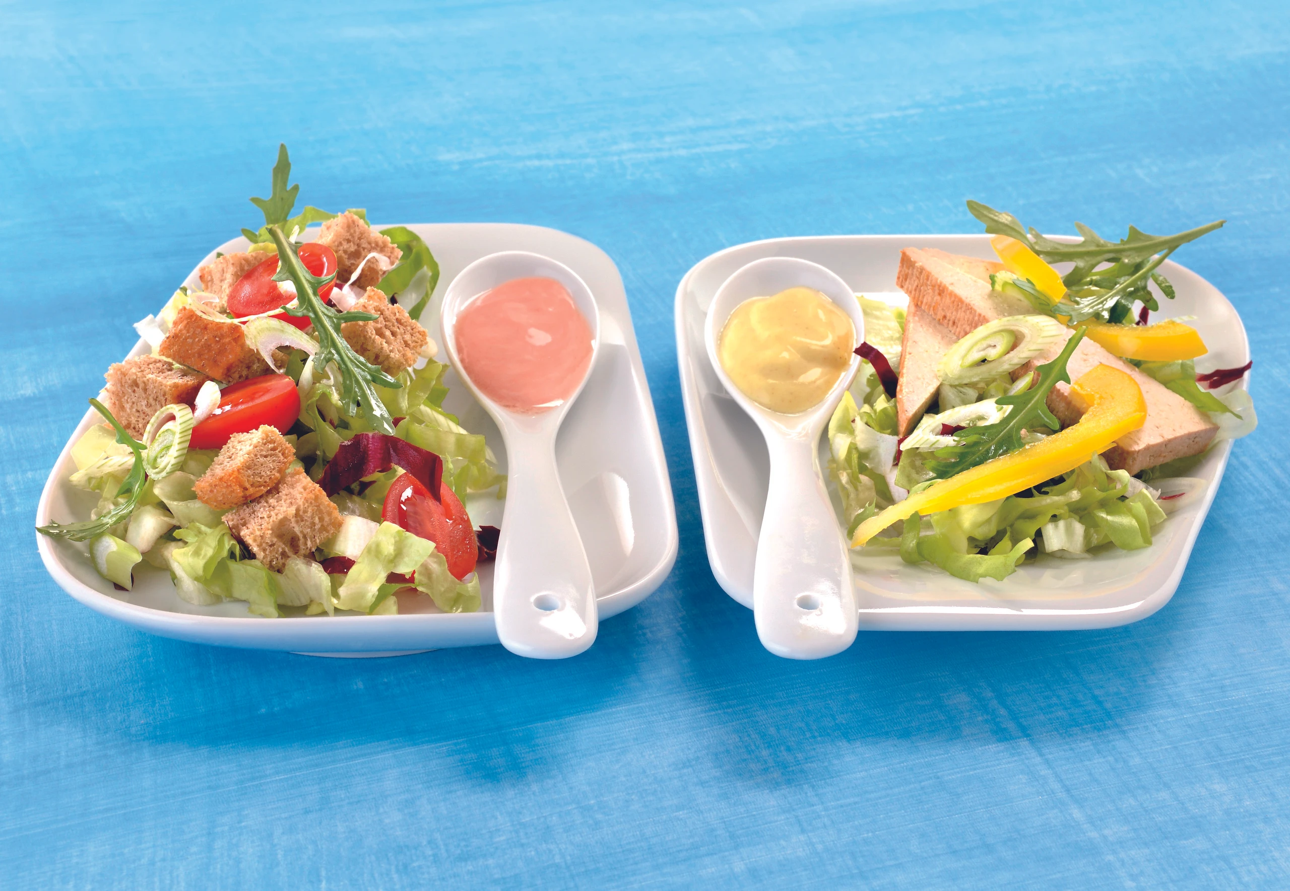 Für den Basis-Salat Jungzwiebeln putzen und in Ringe schneiden. Radicchio und Endiviensalat in feine Streifen schneiden. Rucola in mundgerechte Stücke zupfen. Stangensellerie in feine Scheiben schneiden. Blattsalate, Sellerie und Jungzwiebeln mit Zitronensaft und Olivenöl vermischen. Salat mit Salz und Pfeffer abschmecken.
