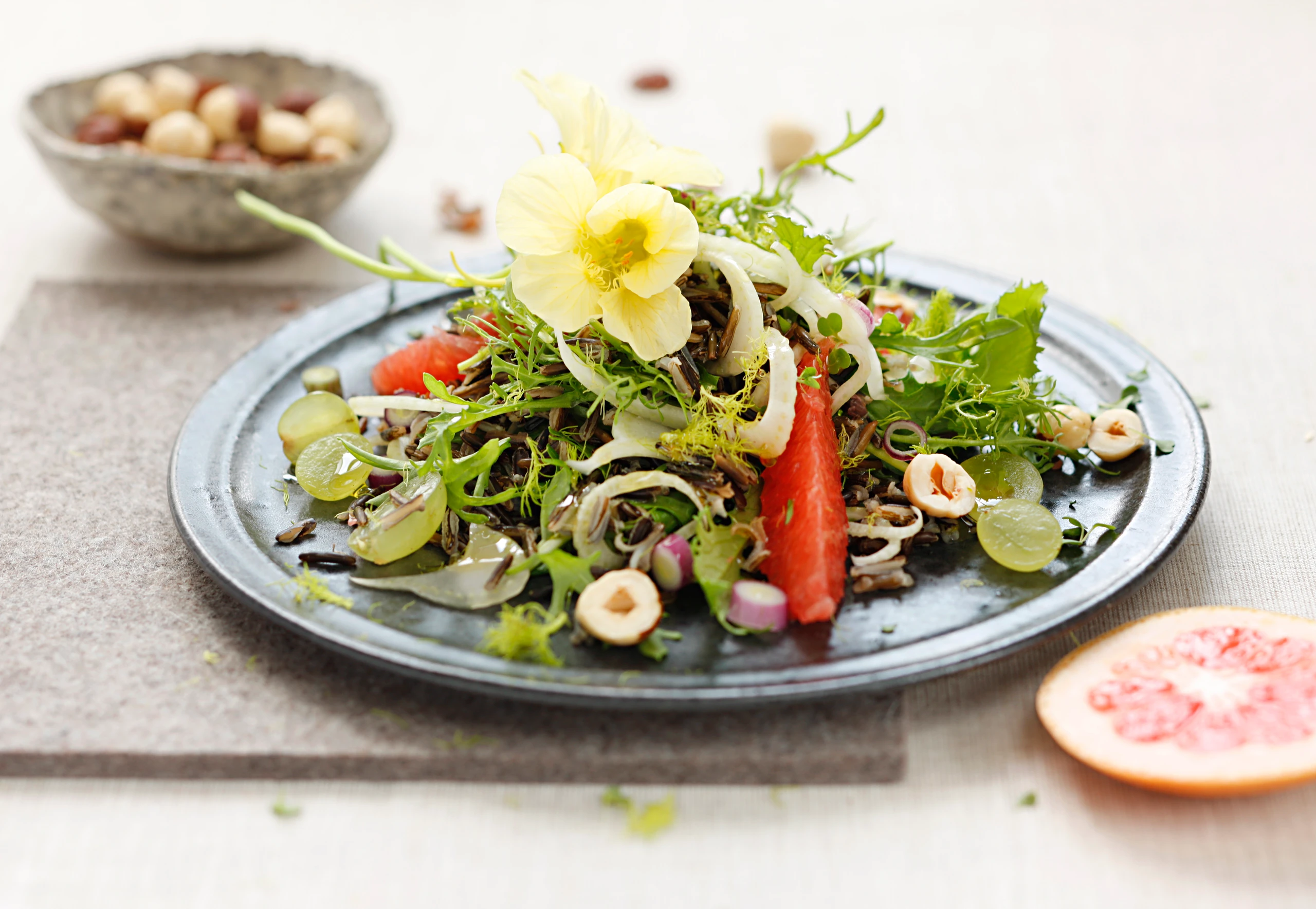 Blattsalate, Fenchel, Früchte und Reis locker mit der Vinaigrette vermischen. Salat anrichten und mit Haselnüssen bestreuen; eventuell mit Kapuzinerkresse- oder anderen Blüten garnieren.