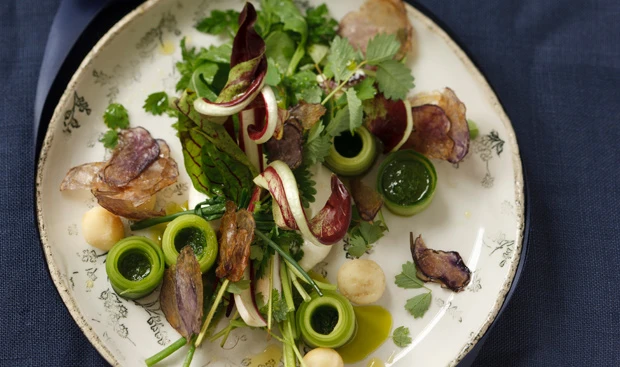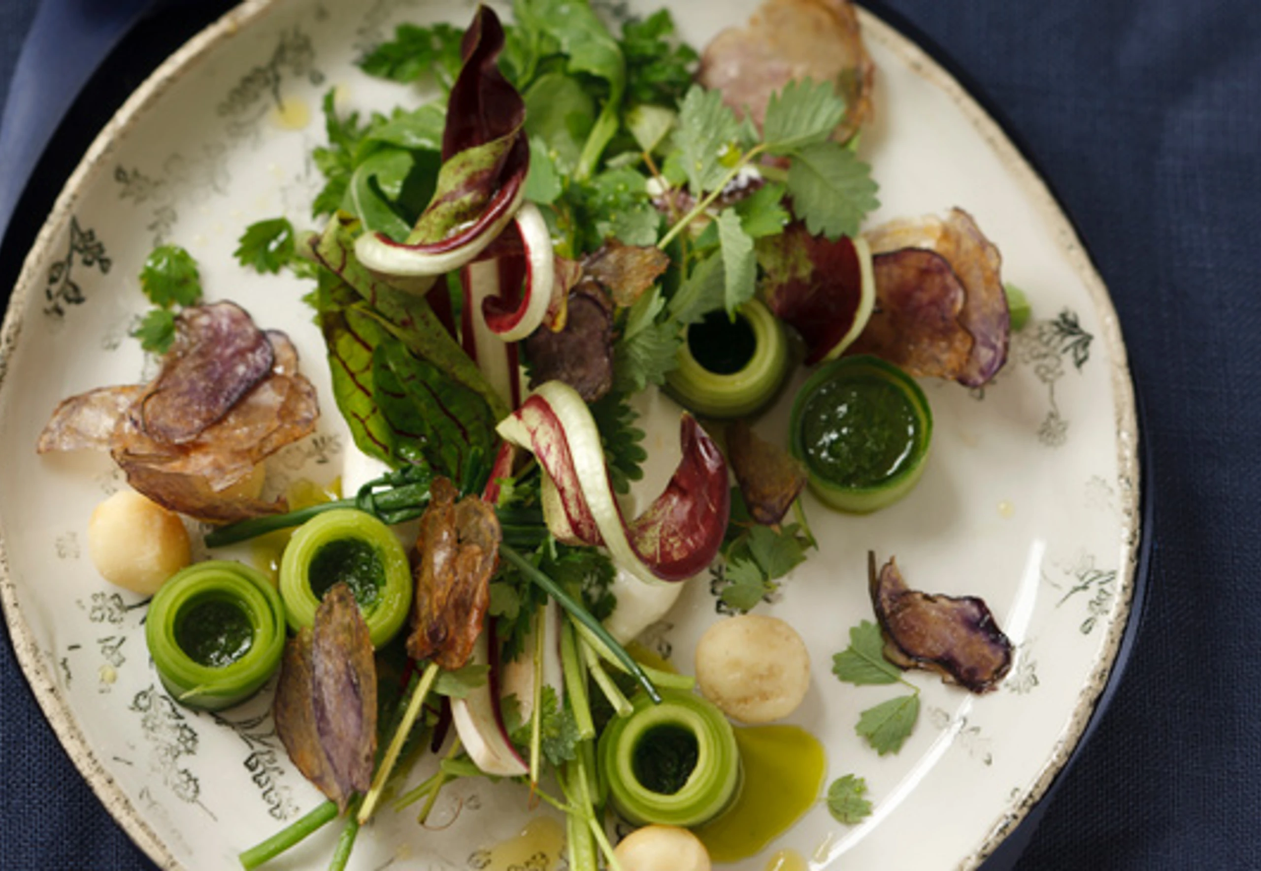 Wacholderrahm auf Tellern verteilen, Salatsträußchen, Gurkenrollen und Dillöl darauf verteilen. Mit Erdäpfelchips und Macadamia-Nüssen garnieren.