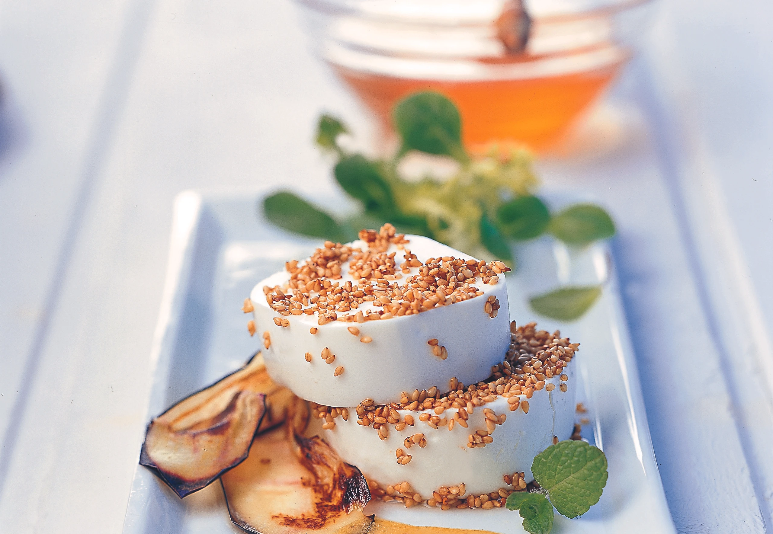 Käse in Scheiben schneiden, auf einen Teller legen, mit Olivenöl beträufeln und mit Sesam bestreuen. Salate und Minze waschen.