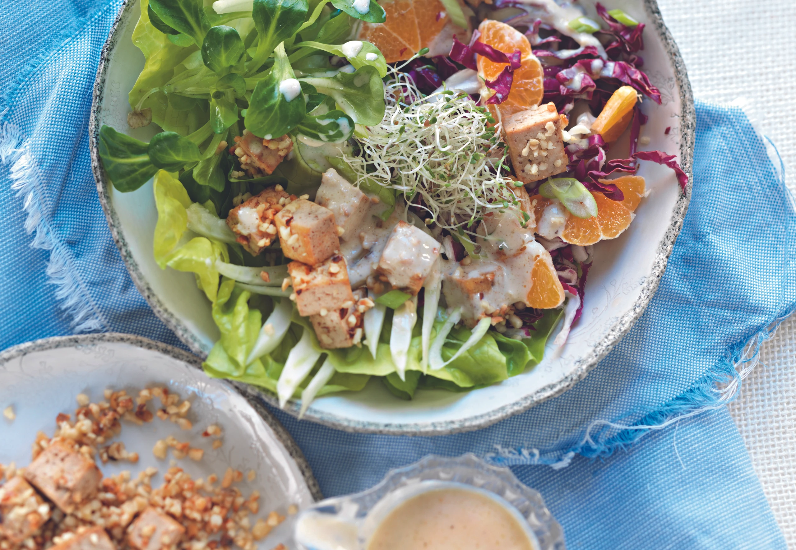 - Blattsalate, Mandarinen und Fenchel portionsweise mit dem Dressing anrichten, mit Tofu, Jungzwiebeln und Sprossen bestreuen.
