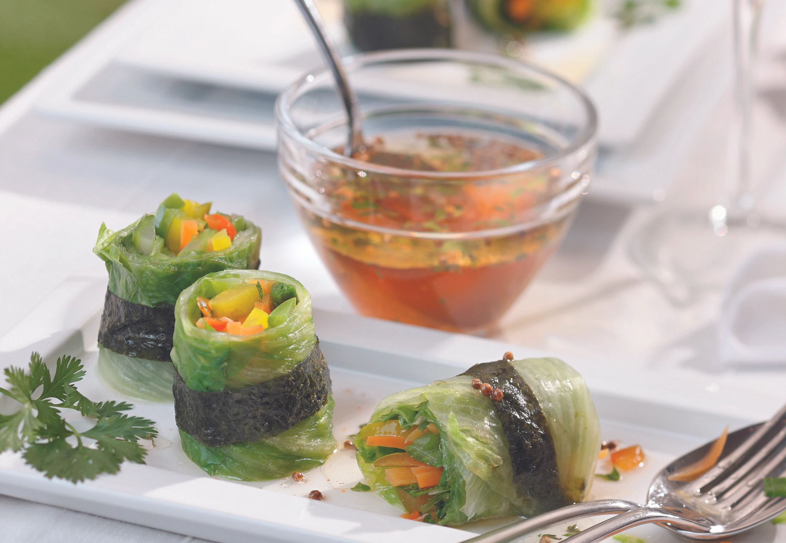 Noriblätter in 2 cm breite Streifen schneiden. Je 6 Salatblätter nebeneinander überlappend auflegen, am unteren Rand mit dem Gemüse belegen und strudelartig einrollen. Jede Rolle in 8 Stücke schneiden und diese in der Mitte mit einem Noristreifen umwickeln.