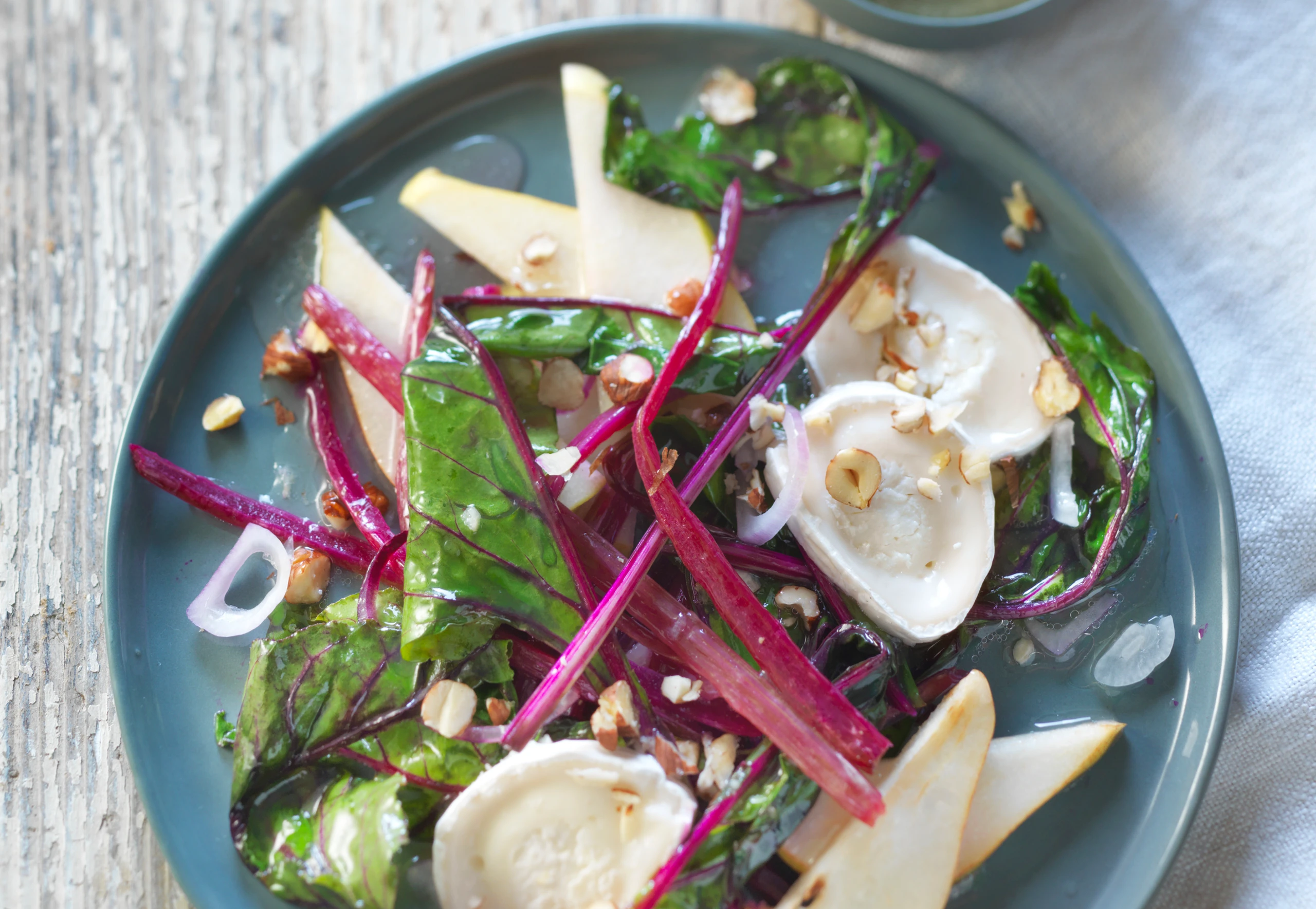 Rübenblätter putzen, Stängel abschneiden, längs halbieren und in ca. 5 cm lange Stücke schneiden. Kleine Blätter ganz lassen, große längs halbieren. Zwiebel schälen und in feine Ringe schneiden. Birnen in dünne Spalten schneiden, mit Zitronensaft vermischen. Ziegenrolle in dünne Scheiben schneiden, Haselnüsse grob hacken.
