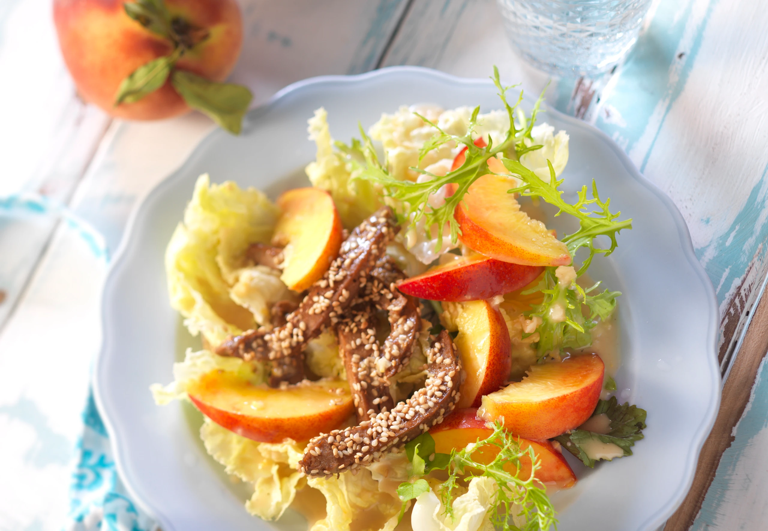Salate zerpflücken und in mundgerechte Stücke zupfen. Pfirsiche in kleinen Spalten vom Kern schneiden. Für das Dressing Haferobers, Zitronensaft, Balsamico und Sojasauce glatt rühren, mit Salz und Pfeffer würzen.