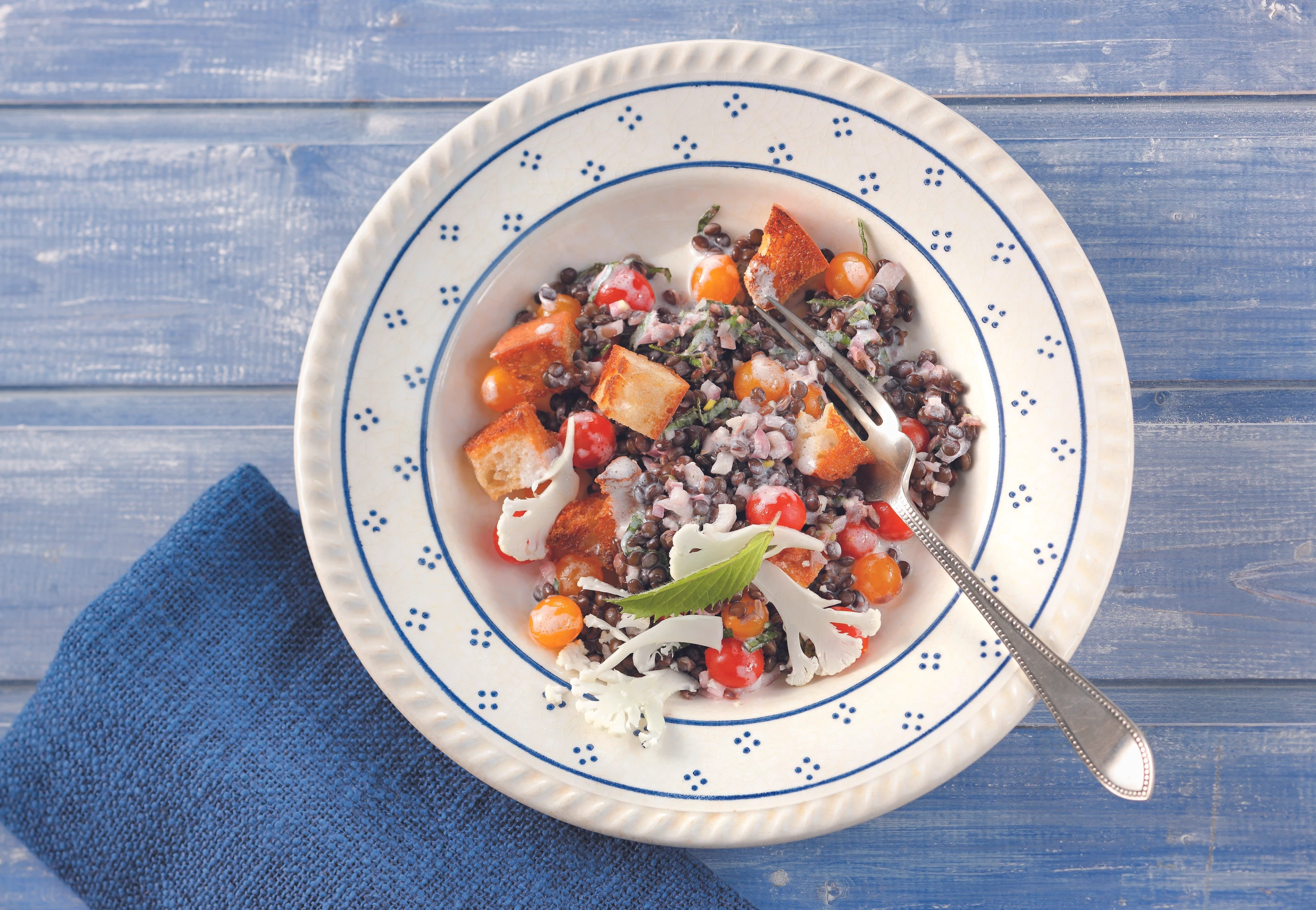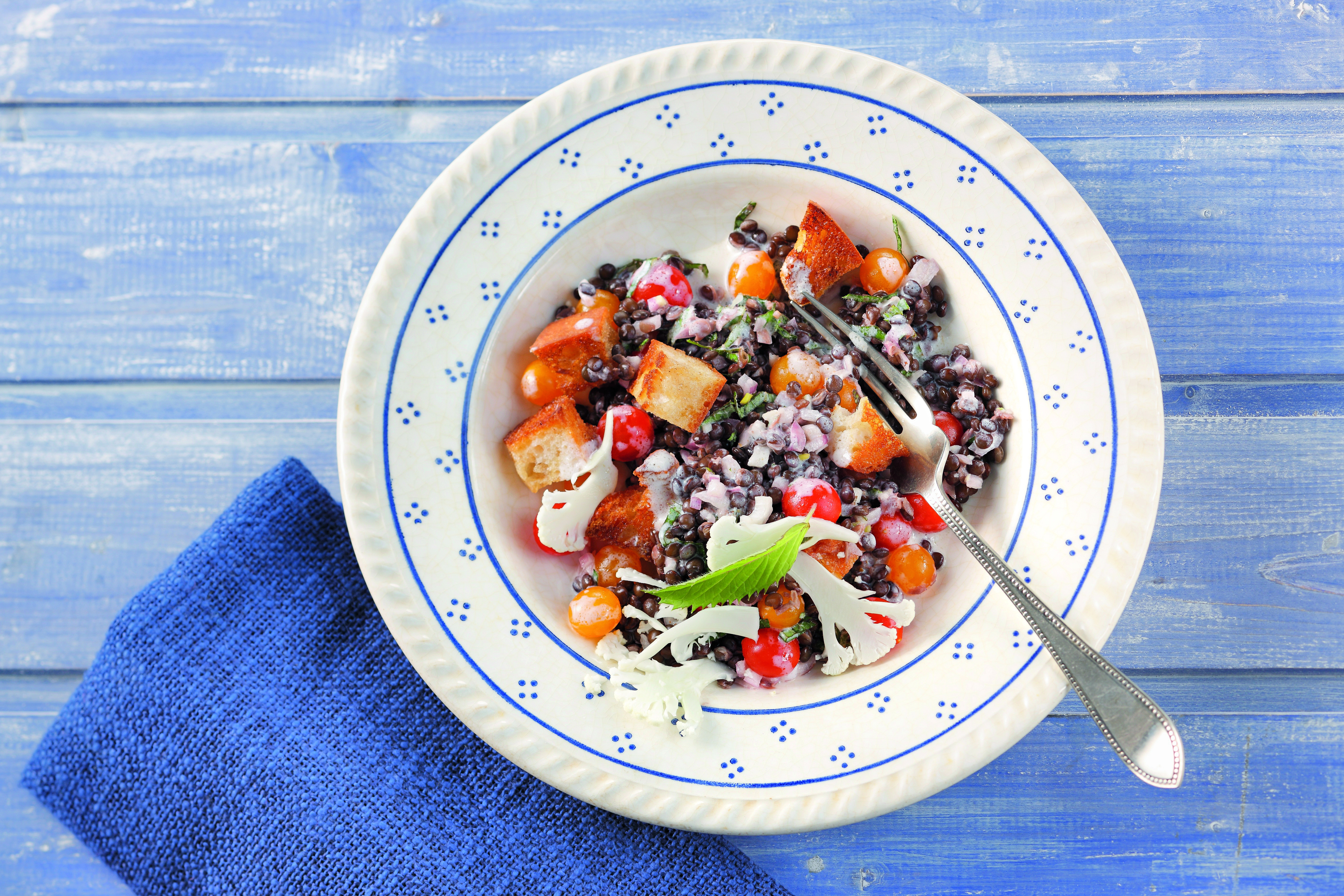 Linsensalat mit den Brotwürfeln locker vermengen, mit den Karfiolscheiben bestreut servieren.