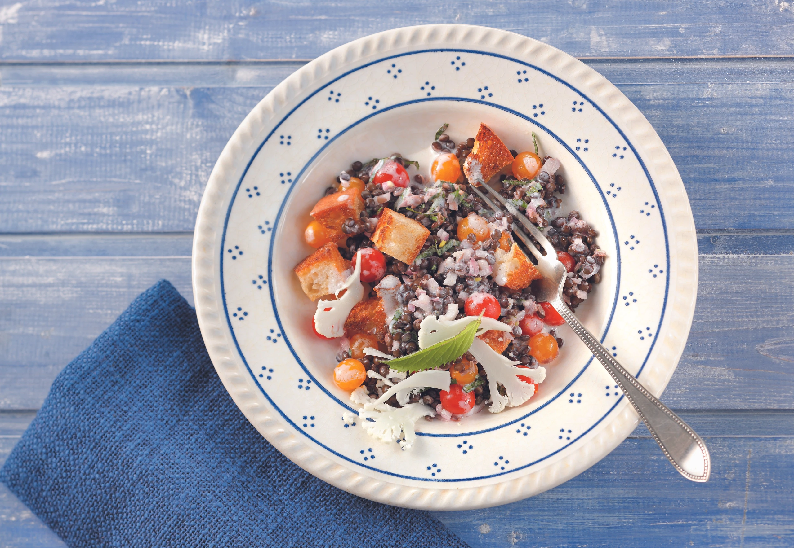 Salat von schwarzen Linsen, Karfiol und Mini-Paradeisern