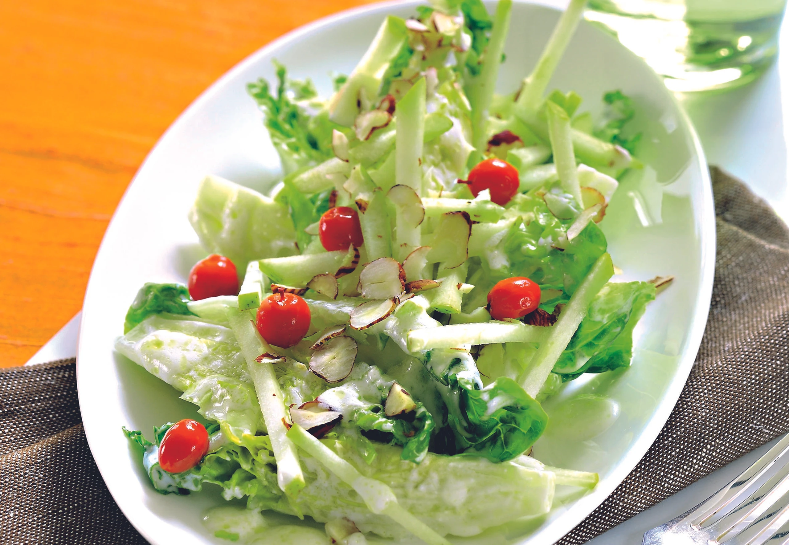 Für die Marinade Zitronensaft salzen, pfeffern und mit dem Öl verrühren. Salatherzen behutsam mit Marinade und Joghurt vermischen, auf Tellern anrichten, mit Birnenstiften, Nüssen und Vogelbeeren garniert servieren.