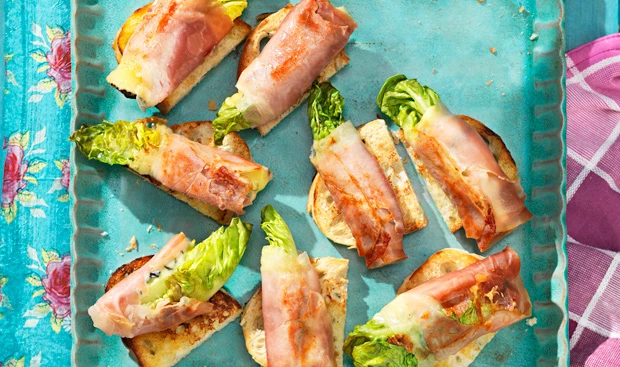 - Ciabattascheiben halbieren. Dolcelatte in 12 Streifen schneiden. Salatherzen putzen, der Länge nach vierteln, mit je einem Stück Dolcelatte belegen und pfeffern. Jedes Salatherz mit einer Scheibe Prosciutto umwickeln und auf einen Teller geben.