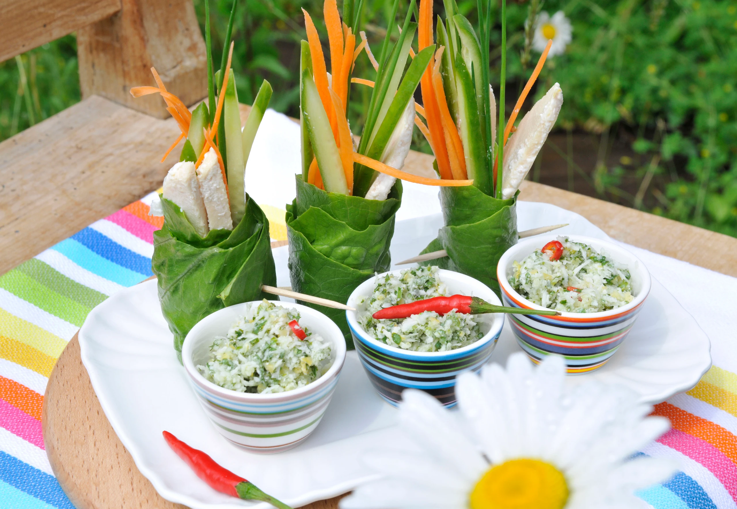 - Je 2 Salatblätter übereinanderlegen, in die Mitte Schnittlauch, Hühner-, Karotten- und Gurkenstreifen geben. Salatblätter einrollen, mit Zahnstochern fixieren. Röllchen an der Unterseite gerade abschneiden und mit Kokos-Relish servieren.