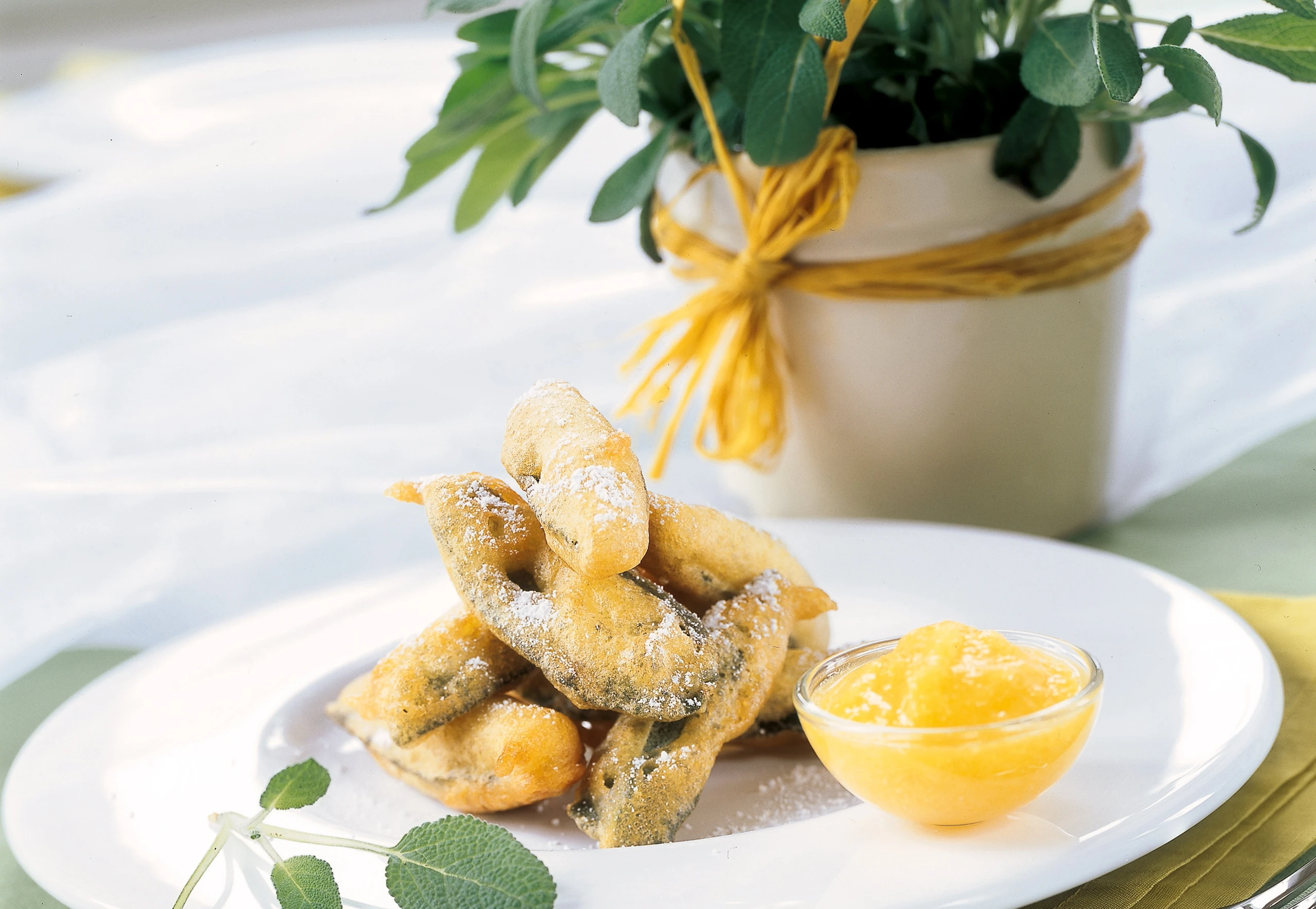 Ca. 2 Finger hoch Öl erhitzen. Salbeiblätter am Stiel fassen, durch den Teig ziehen und beidseitig goldbraun backen. Blätter herausheben, auf Küchenpapier abtropfen lassen, mit Zucker bestreuen und mit der Sauce anrichten.