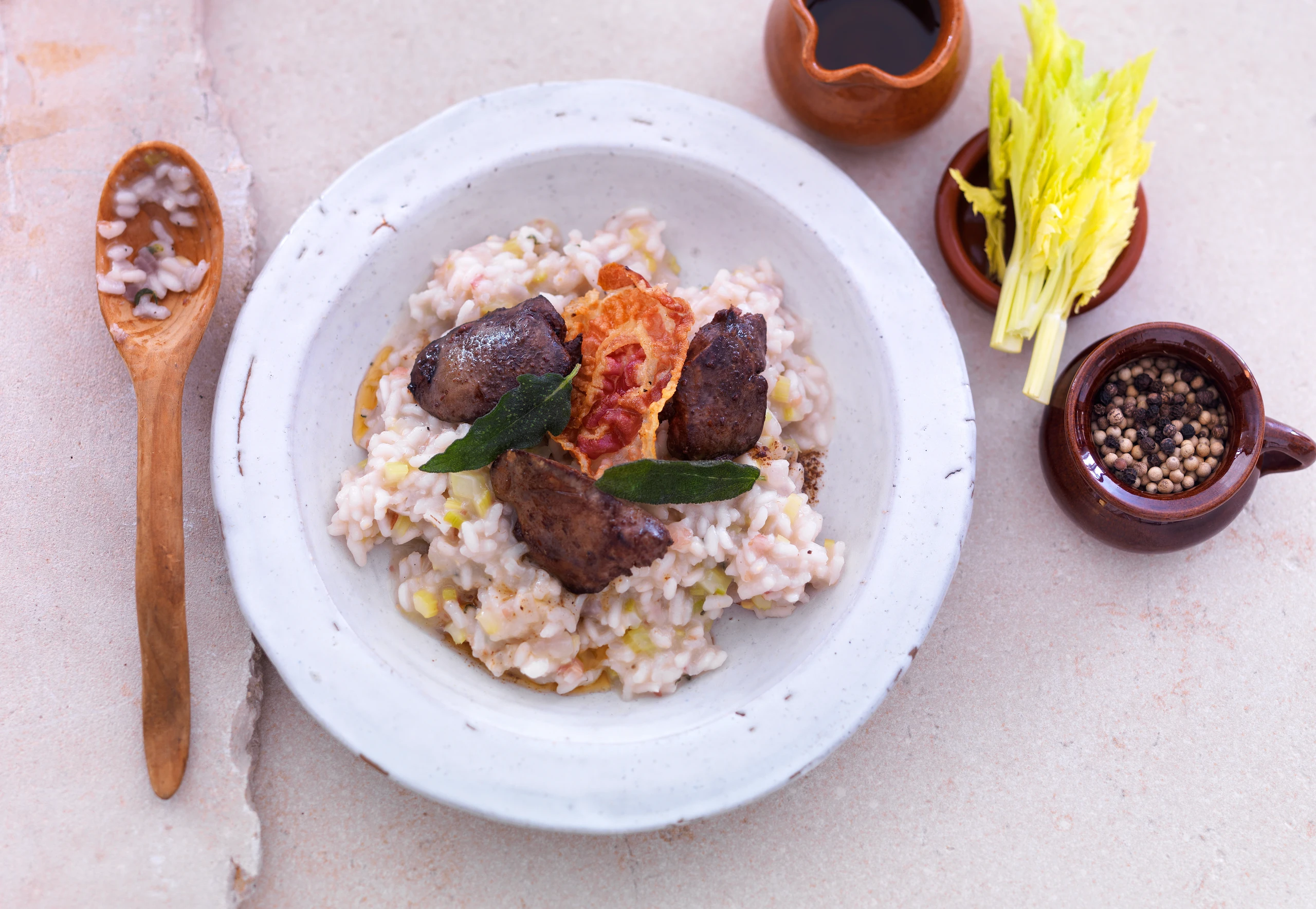 Parallel dazu Hühnerleber pfeffern und im Öl beidseitig rosa braten. Butter zugeben, Leber darin schwenken, salzen und aus der Pfanne nehmen. Im Bratrückstand übrige Pancetta und restlichen Salbei knusprig braten. Risotto in vorgewärmten Tellern anrichten, mit Leber, Pancetta und Salbei garniert servieren.