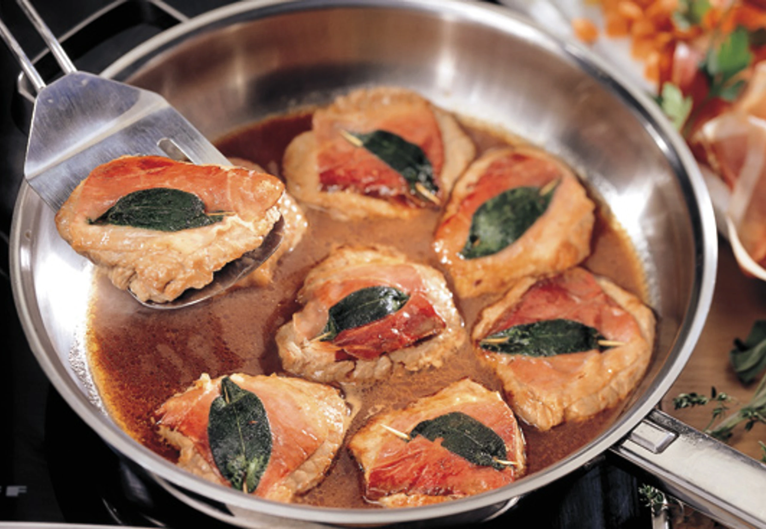 Rohr auf 50°C vorheizen. Schnitzel zwischen Frischhaltefolie klopfen, mit Salz und Pfeffer würzen. Je ein Schinken- und Salbeiblatt darauf legen und mit einem Zahnstocher fixieren.