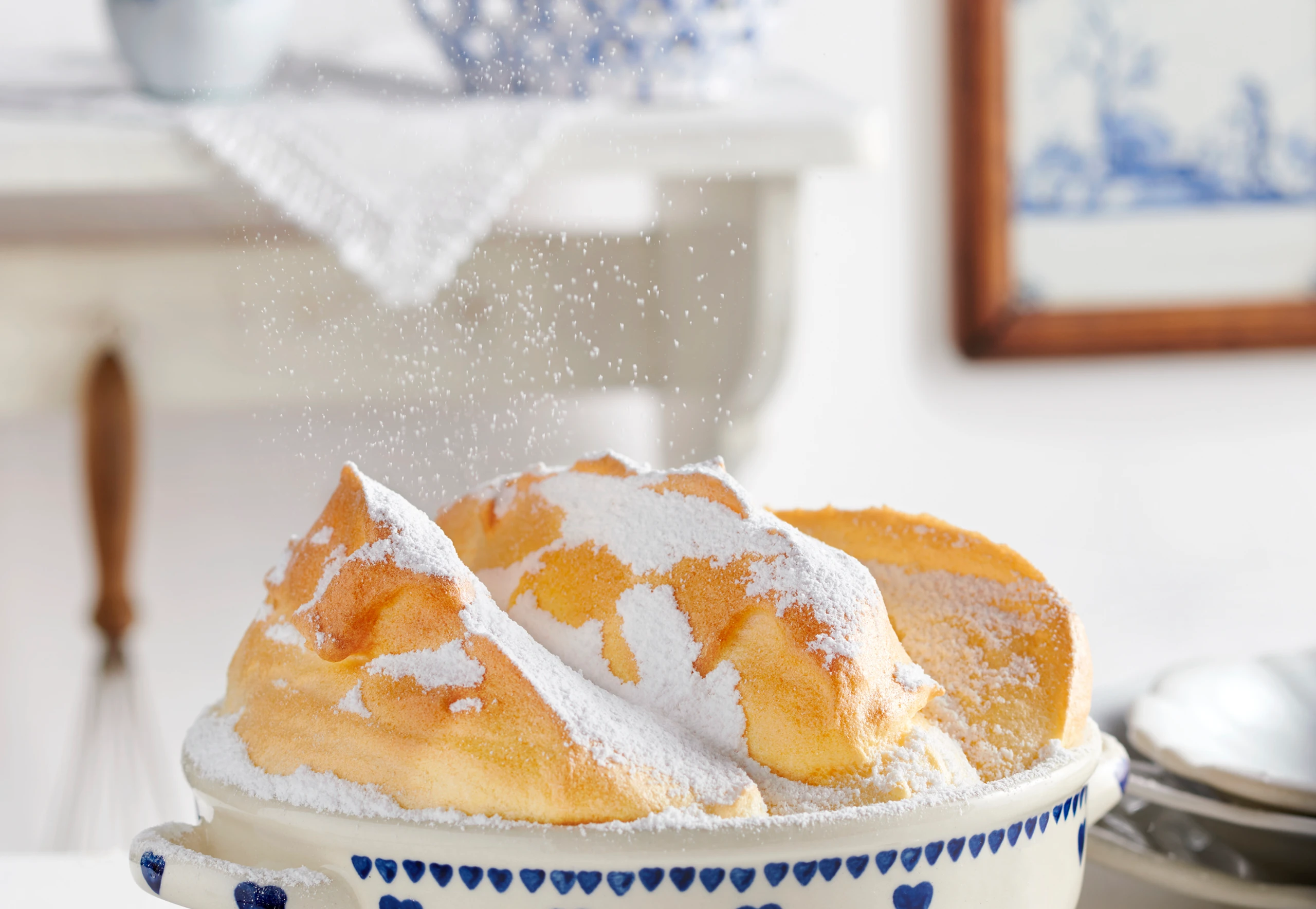 Schnee mit einer Teigkarte in die Form füllen und im Rohr ca. 16 Minuten backen. Herausnehmen, mit Staubzucker bestreuen und sofort servieren.