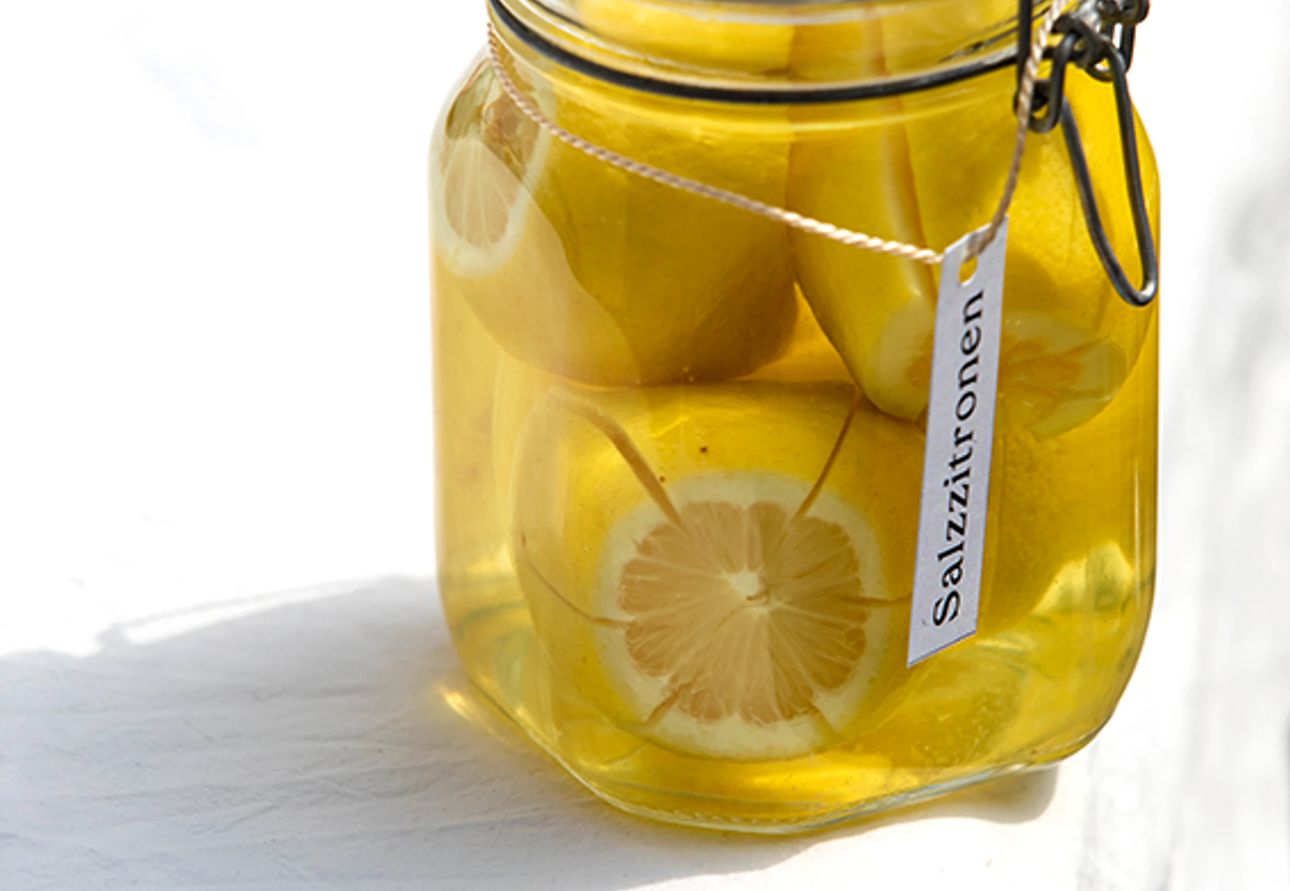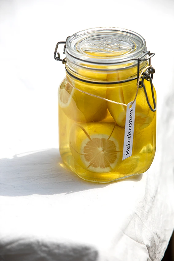 Zitronenenden abschneiden. Zitronen mehrfach längs einschneiden, ohne sie durchzuschneiden. Jeden Einschnitt mit 1/2 TL Salz füllen.