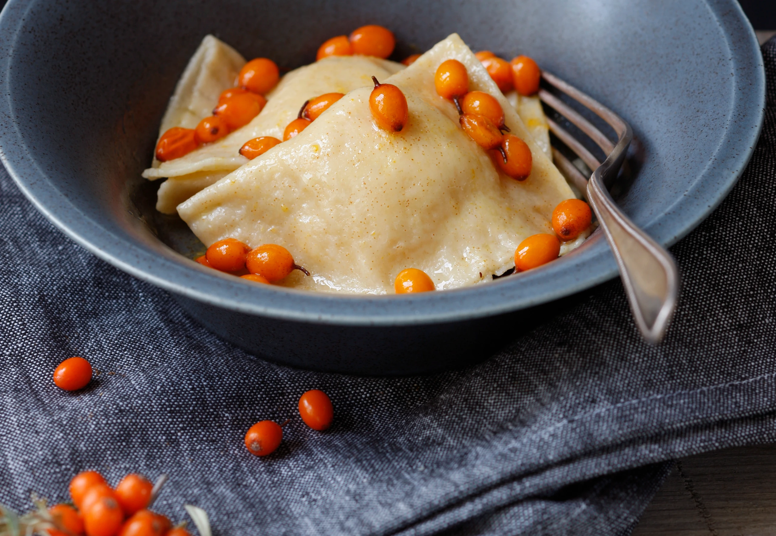 In einer Pfanne Butter schmelzen, Sanddornbeeren darin kurz ziehen lassen. Ravioli herausheben, gut abtropfen lassen und in der Sanddornbutter schwenken.