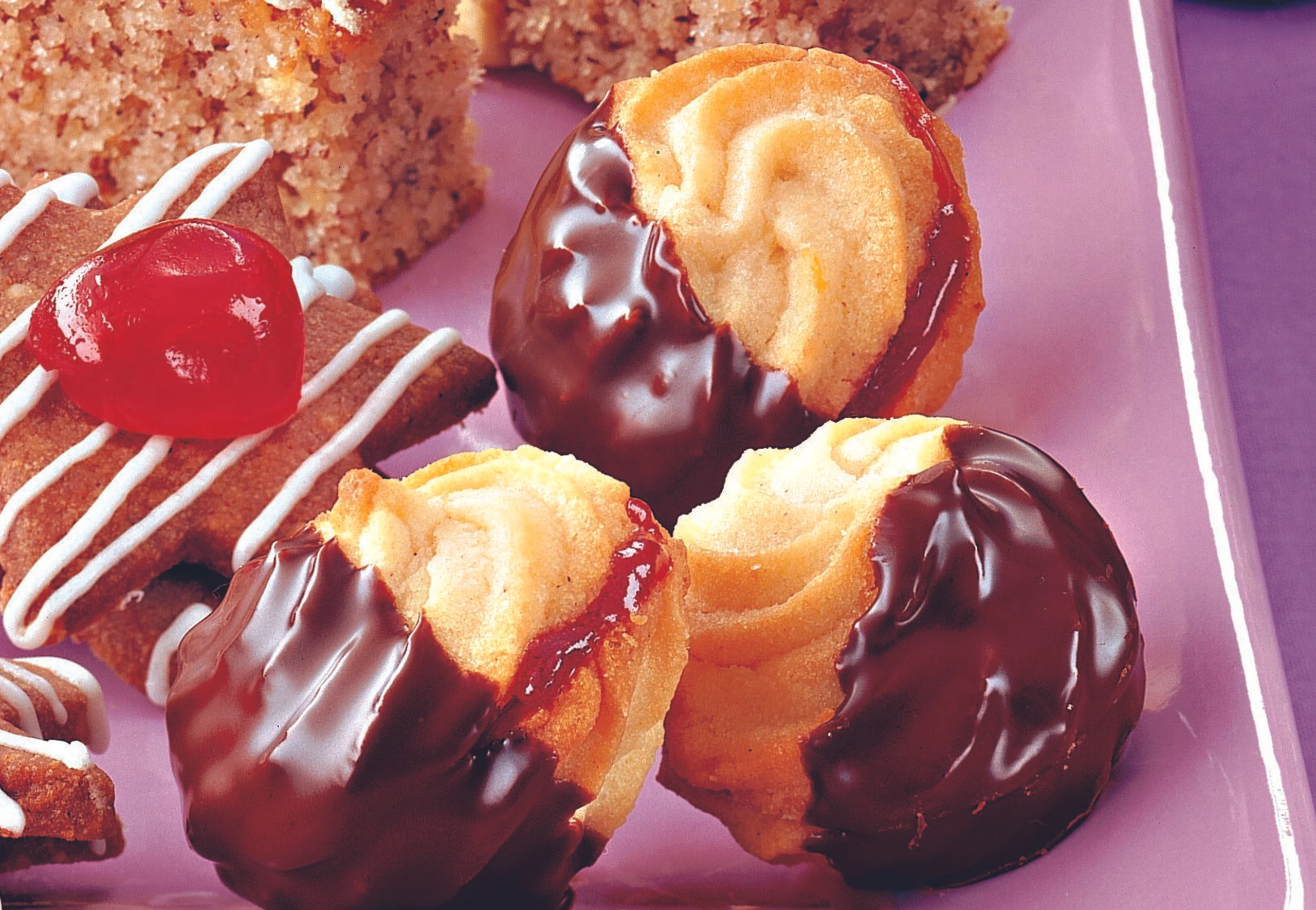 Die Hälfte der Kekse mit Marmelade bestreichen, übrige darauf setzen. Kuvertüre über Dampf schmelzen, Kekse zu einem Drittel eintauchen, auf Backpapier legen, Kuvertüre fest werden lassen.
