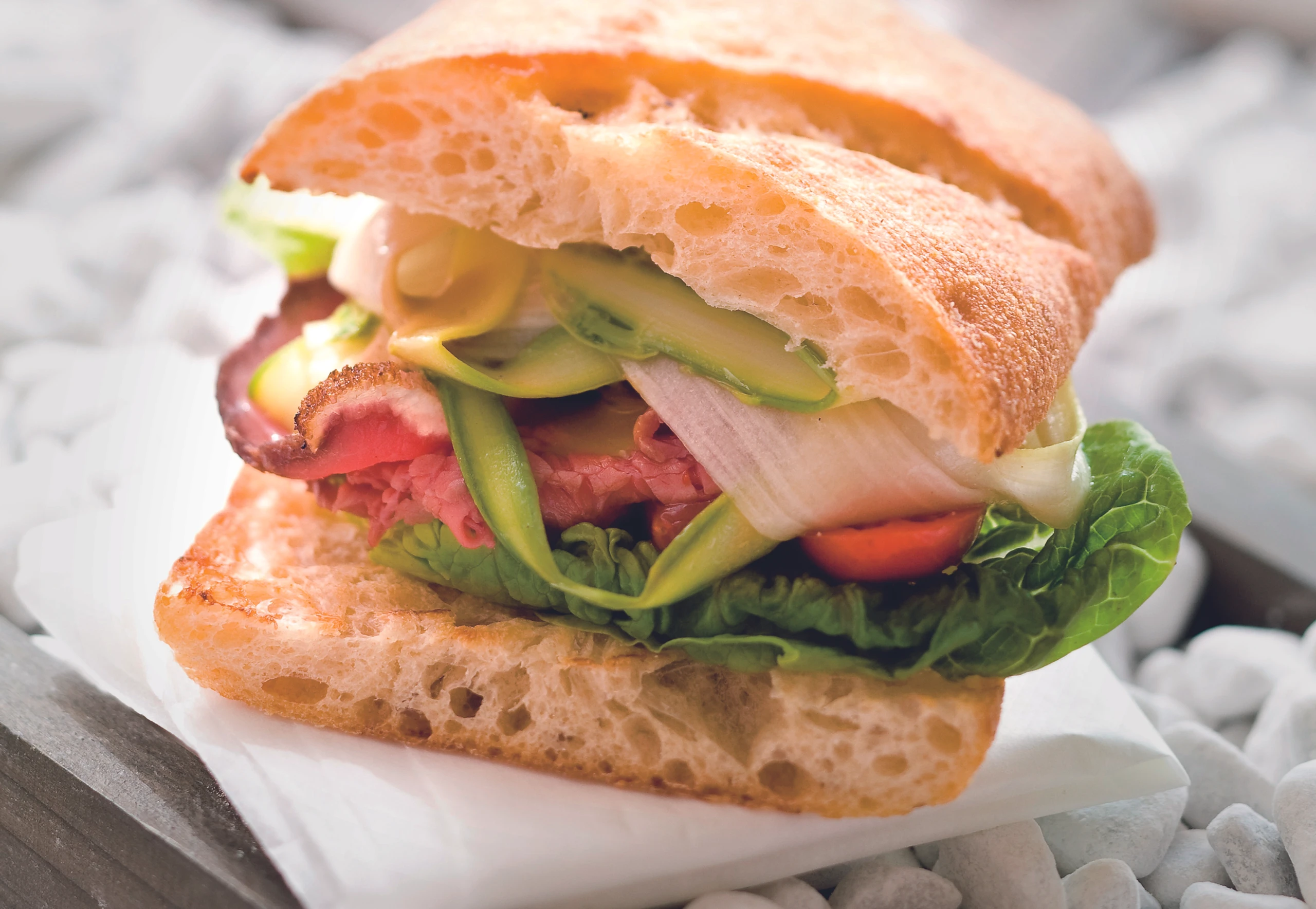 - Roastbeef in dünne Scheiben schneiden. Spargel aus der Marinade nehmen. Brot-Unterseiten mit Salatblättern und Paradeisern belegen. Roastbeef darauf legen, Spargel darauf verteilen, Deckel darauf setzen.