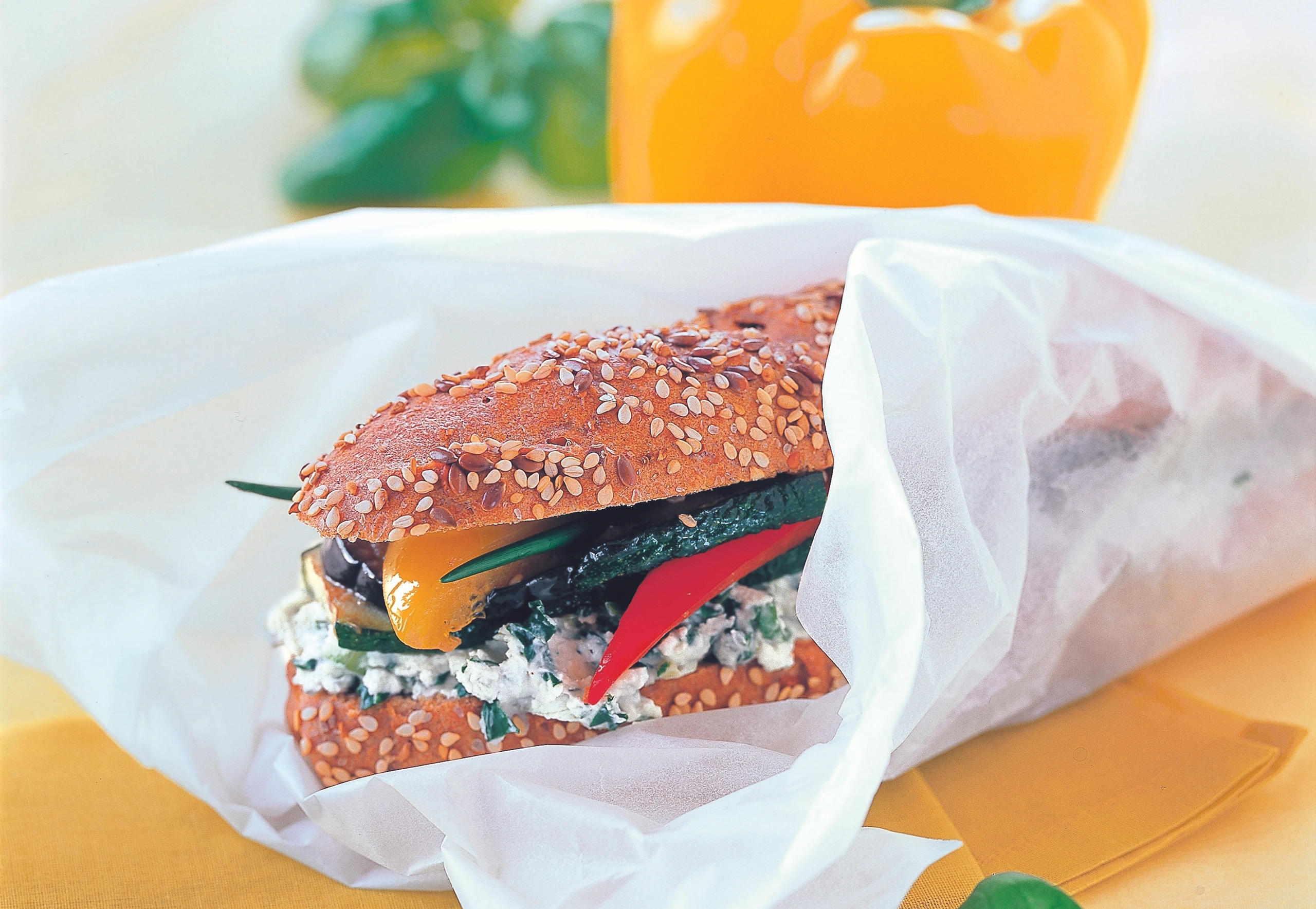 - Weckerln durchschneiden, untere Hälften mit der Spinat-Gorgonzola-Creme bestreichen, mit Paprika und Zucchini belegen und mit Schnittlauch bestreuen. Obere Weckerl-Hälften darauf legen.