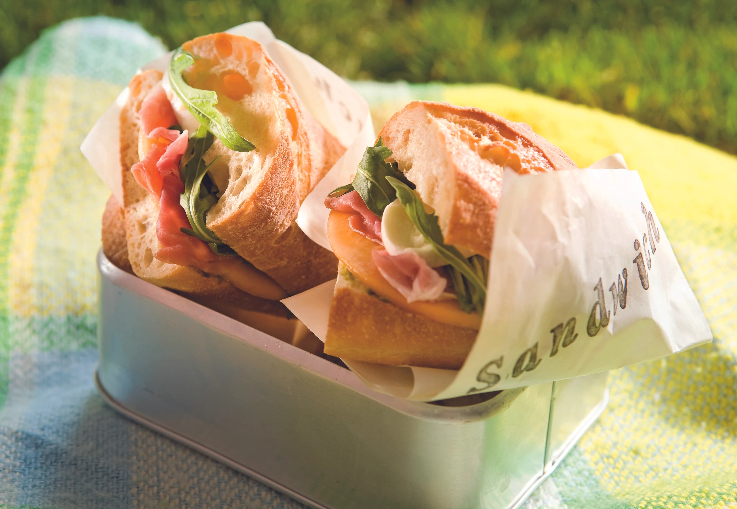 Mit Rucola belegen, Deckel daraufsetzen. Sandwiches in Butterpapier wickeln oder in Papiersäckchen stecken.