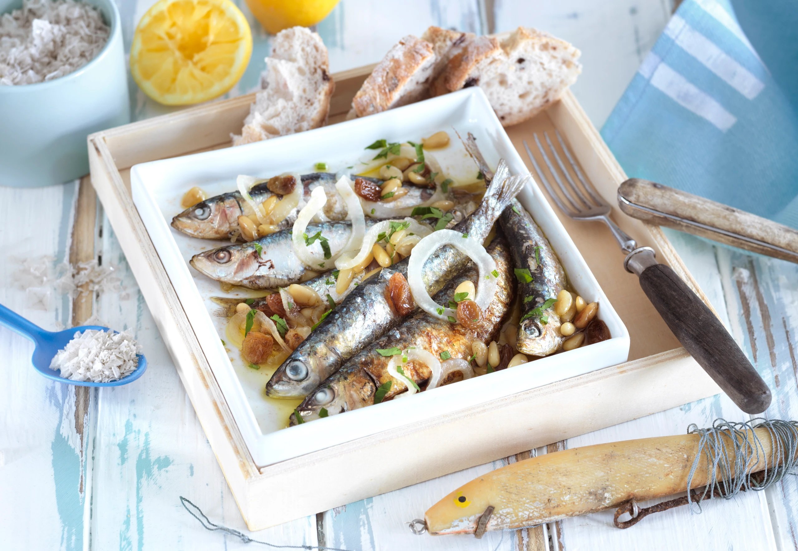 Senfkörner und Pignoli in einer Pfanne ohne Öl rösten, mit Essig ablöschen. Schalotten, Rosinen, Zucker, Zitronensaft, Lorbeerblatt und Pfefferkörner zugeben und aufkochen, bei schwacher Hitze ca. 4 Minuten kochen. Fond noch heiß über die Sardinen gießen. Sardinen zudecken und im Kühlschrank ca. 8 Stunden ziehen lassen.