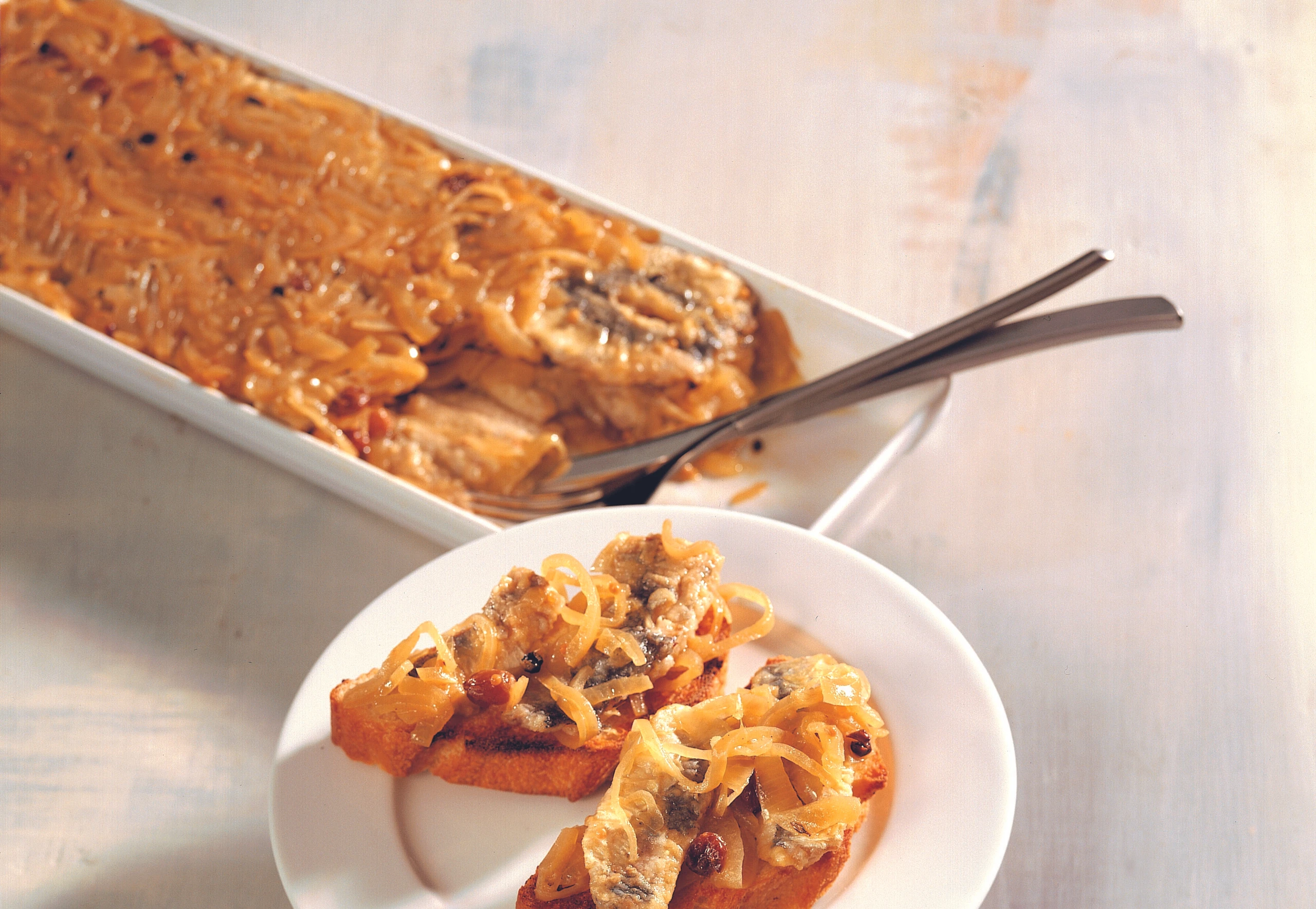 Zwiebeln und Fische abwechselnd in 2–3 Lagen in eine Form schichten (mit Zwiebeln beginnen; jede Schicht mit etwas vom übrigen Essig und Öl beträufeln). Die Fische sollen rundum mit Zwiebeln bedeckt sein. Formenrand mit Eiklar bestreichen, Backpapier darauf legen und festdrücken. Sardinen mind. 24 Stunden kühl ziehen lassen.