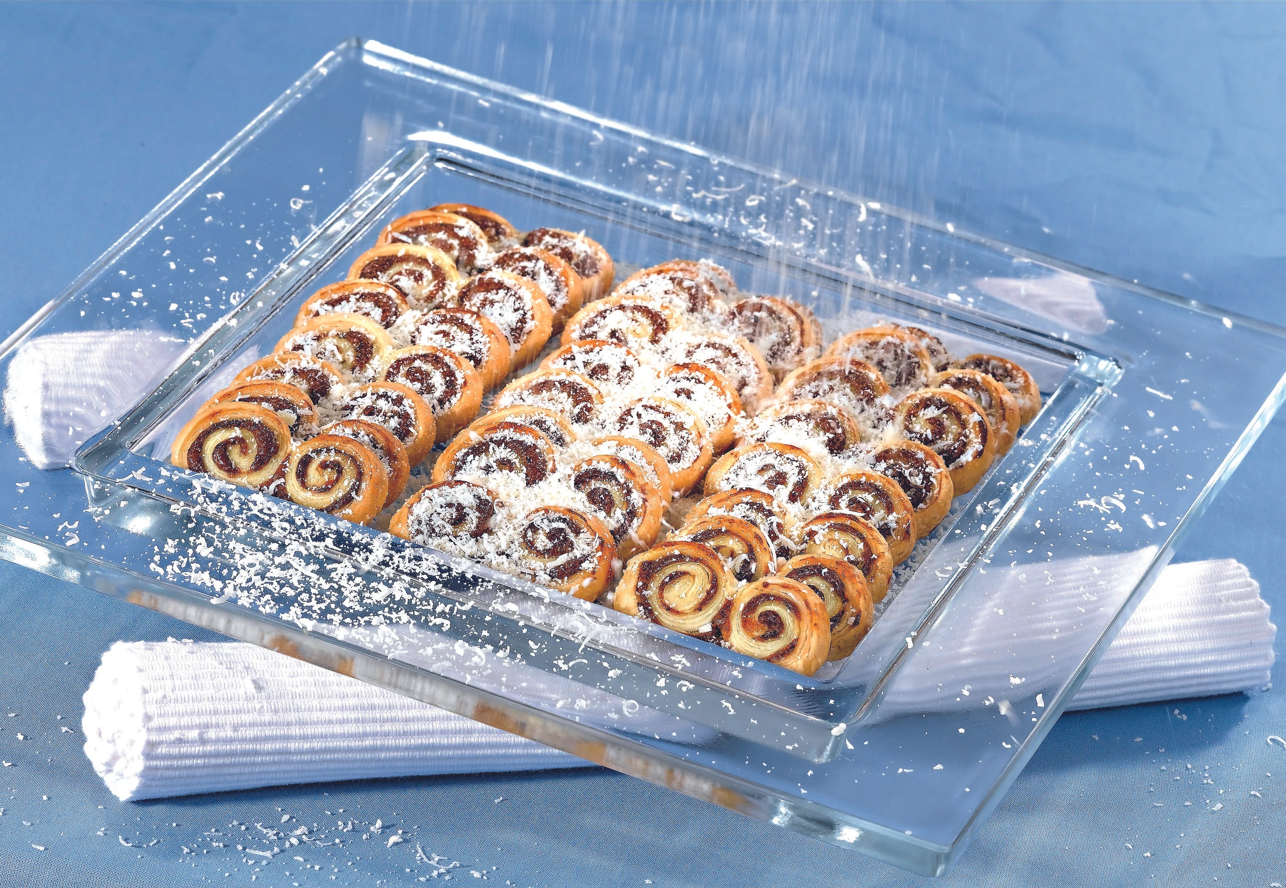 Masse auf dem Blätterteig verstreichen, Teig von beiden Seiten bis zur Mitte hin einrollen. Doppelrolle in ca. 1 cm dicke Scheiben schneiden und auf das Blech legen. Scheiben im Rohr (mittlere Schiene) ca. 20 Minuten backen. Die noch heißen Schnecken mit Parmesan bestreuen.