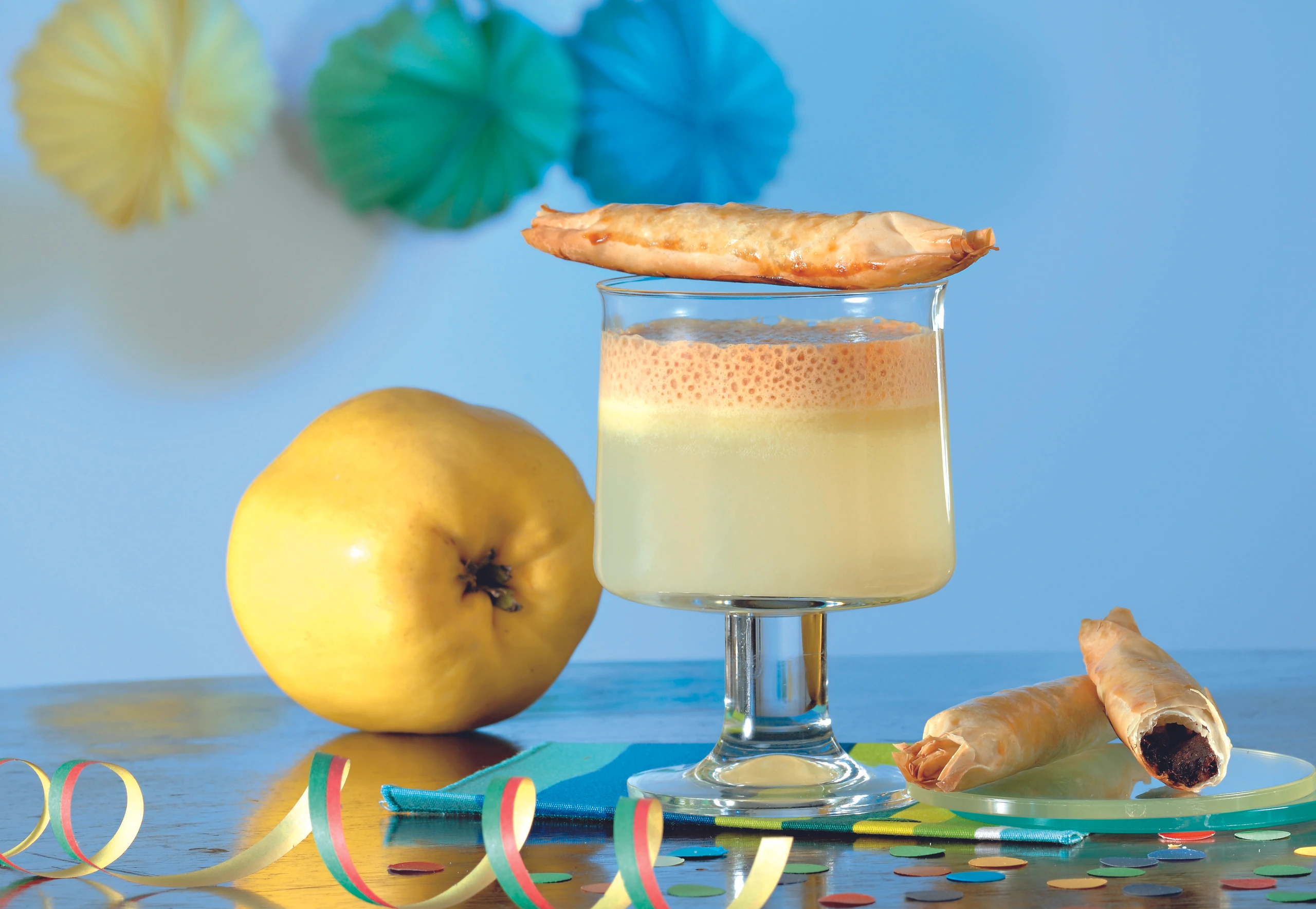 Für den Drink Quitten vierteln, entkernen, grob schneiden und entsaften. Quitten- und Sauerkrautsaft verrühren und in Gläsern verteilen. Mineralwasser zugießen. Drink mit den Strudeln servieren.