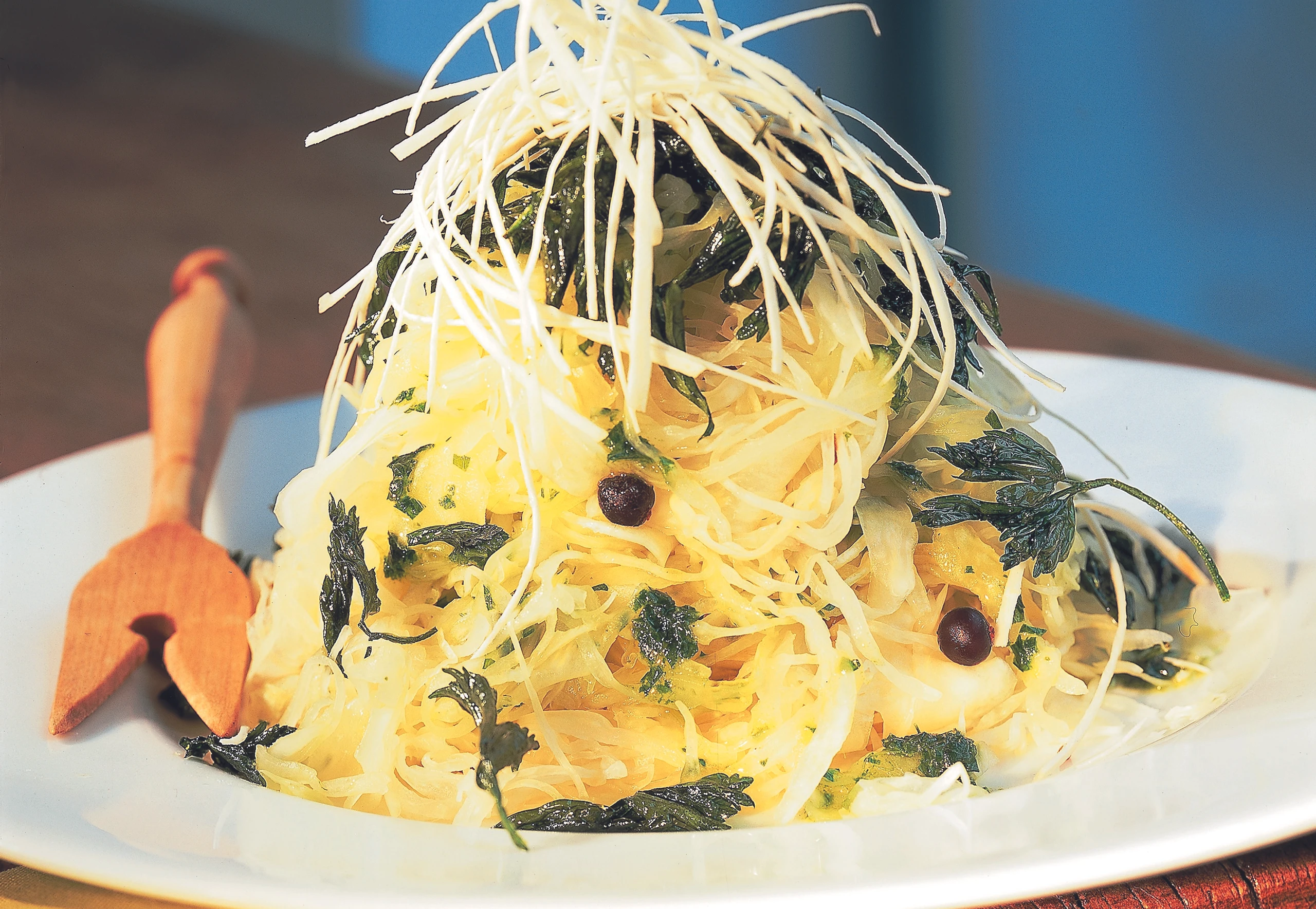 Sauerkraut mit zwei Dritteln vom Petersilpüree, etwas Wasser und Salz vermischen, mit dem restlichen Püree beträufeln, mit Petersilblättern und Kren garnieren.