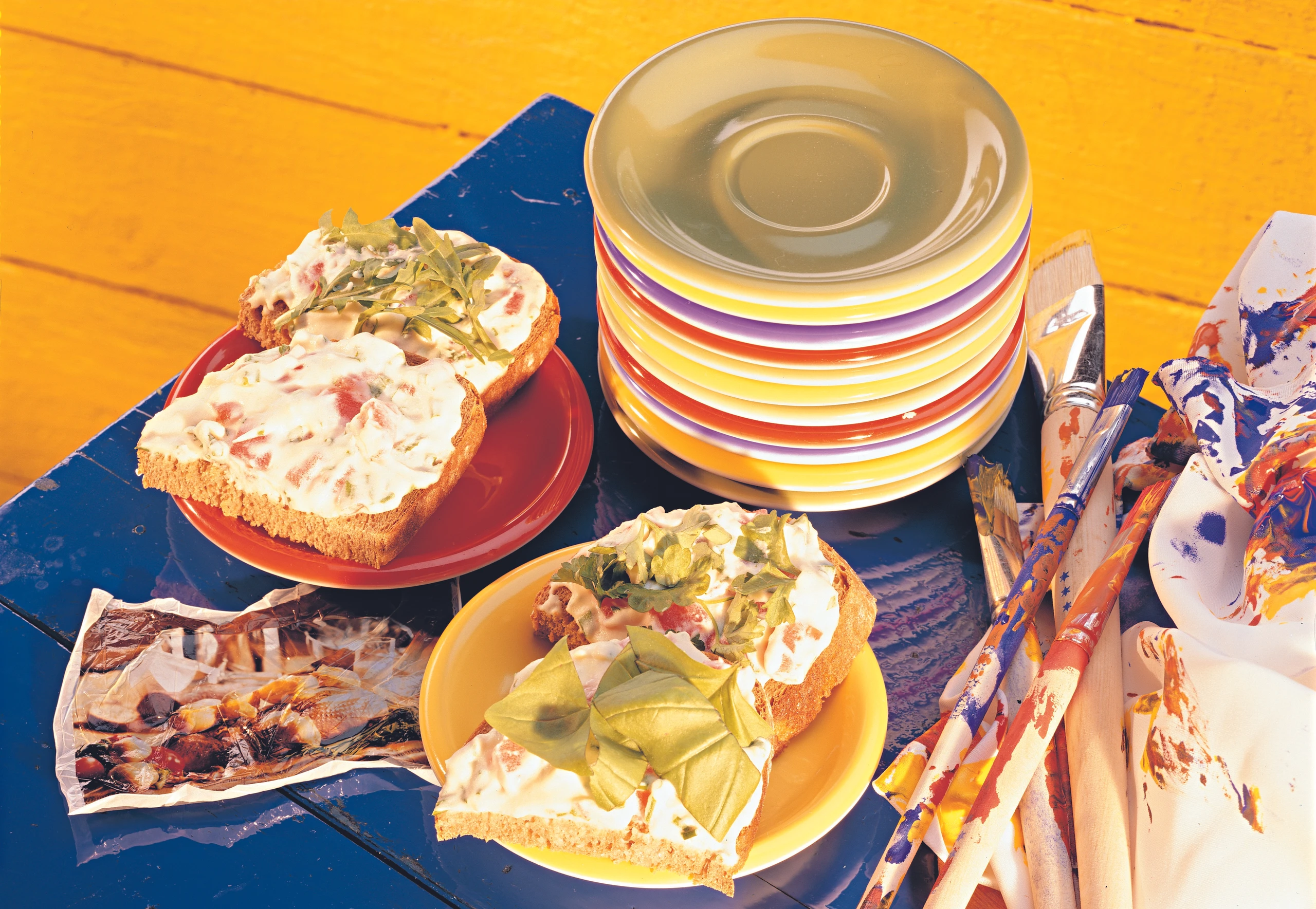 Brote quer halbieren und mit dem Aufstrich bestreichen. Brote mit Rucola- oder Kräuterblättchen garnieren.