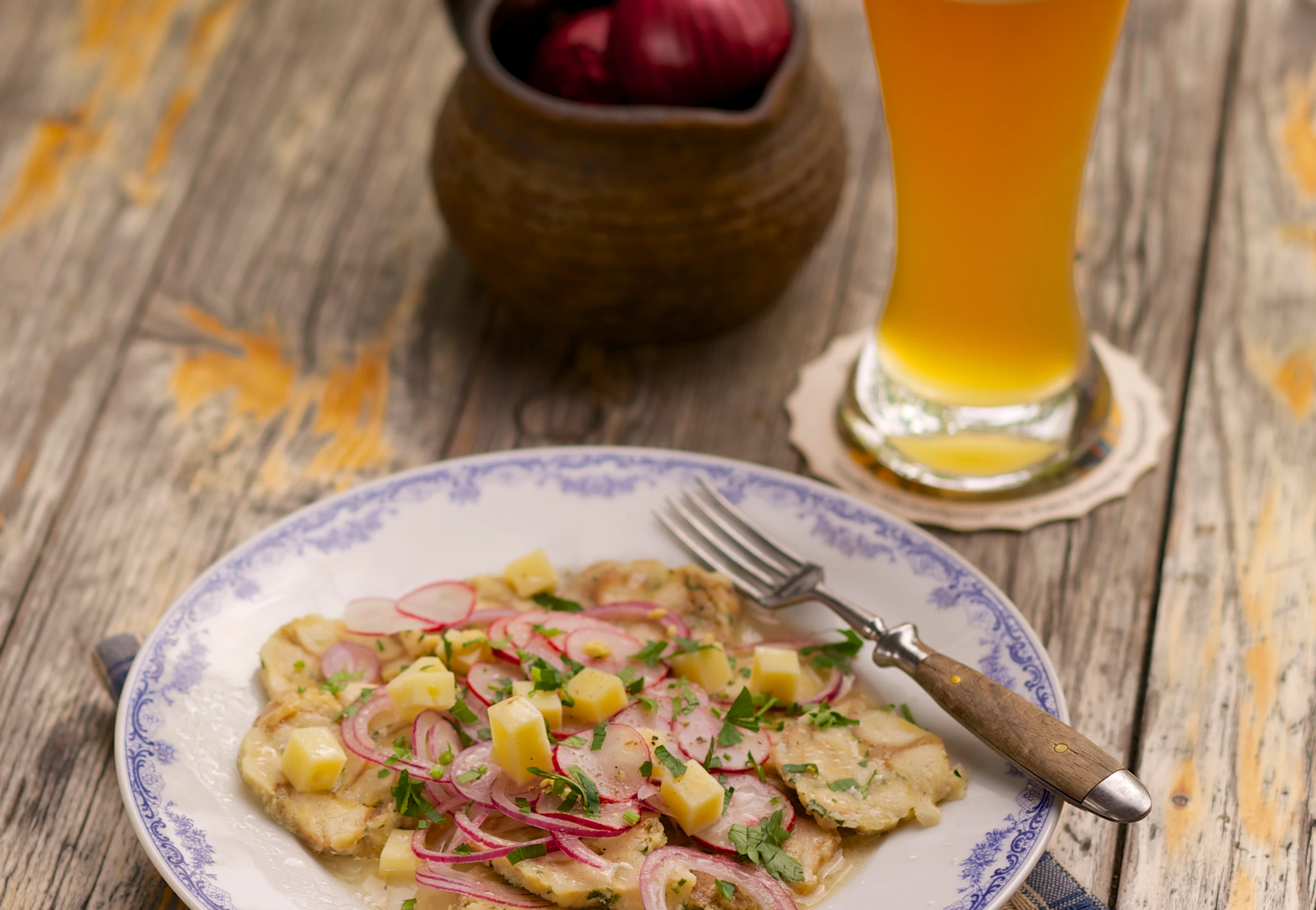 Aus Senf, Essig, Öl, Bier und Apfelsaft eine Marinade rühren, mit Salz und Pfeffer würzen. Knödelscheiben mit Zwiebel, Radieschen und Käse anrichten, mit Marinade übergießen, mit restlicher Petersilie bestreuen und kurz ziehen lassen.