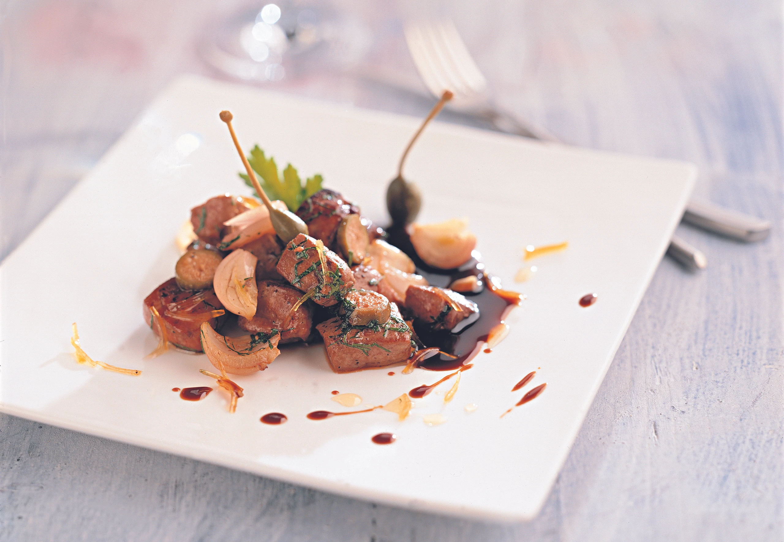Leber in Würfel schneiden, salzen und pfeffern. Pfanne gut heiß werden lassen, 2 EL Öl eingießen, Leber darin rundum scharf anbraten. Hitze reduzieren, Butter, dann Schalotten zugeben und anschwitzen. Bratensaft zugießen und etwas einkochen. Petersilie, Kapern und Konfit untermischen. Butterstücke einrühren, Sauce nicht mehr kochen. Leber anrichten und mit den übrigen Kapern garnieren.