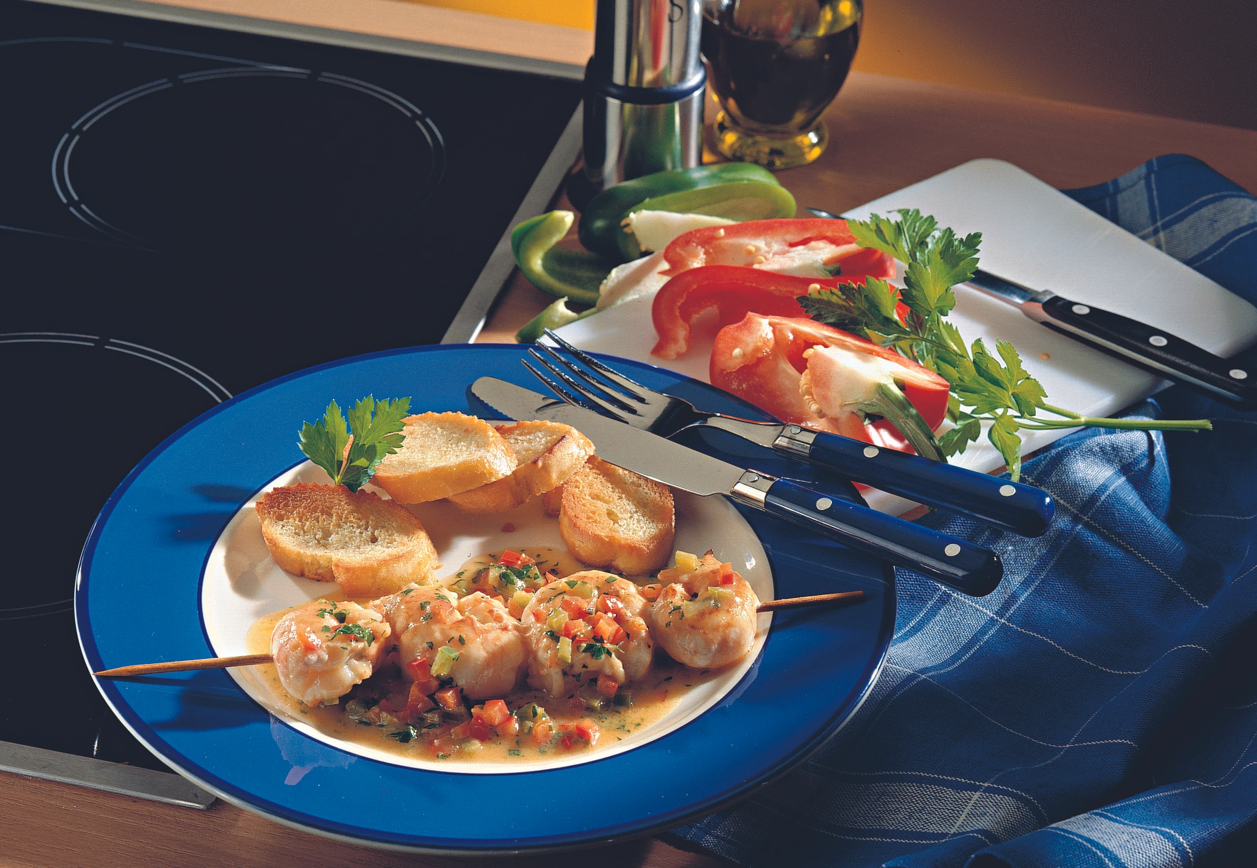 Fond durch Einrühren von kalten Butterstücken binden. Scampispieße in die Sauce legen, ca. 1/2 Minute auf kleiner Flamme darin ziehen lassen, anschließend anrichten. Als Beilage passt geröstetes Weißbrot.