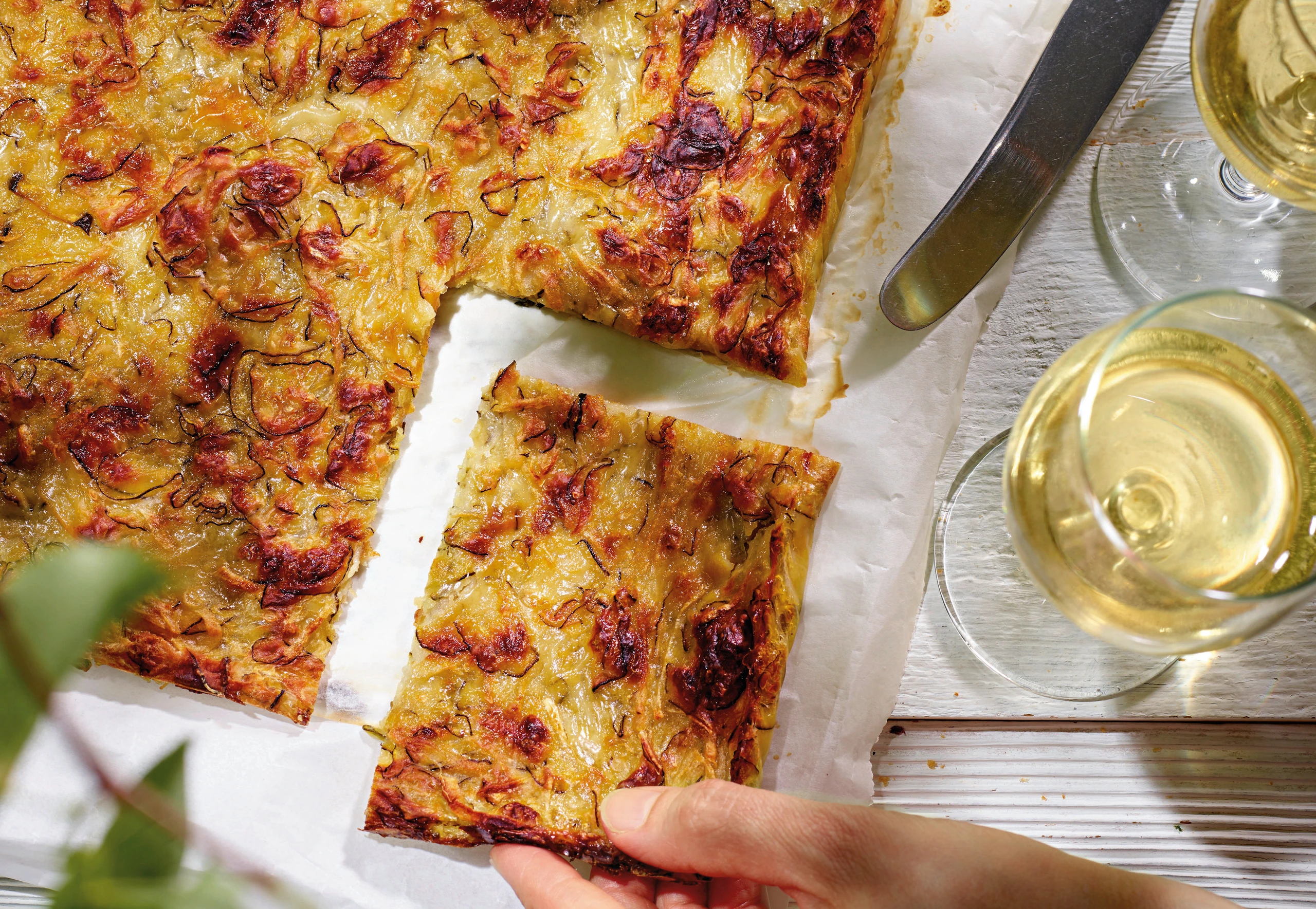Unteres Backpapier abziehen und Tarte in handliche Stücke schneiden.