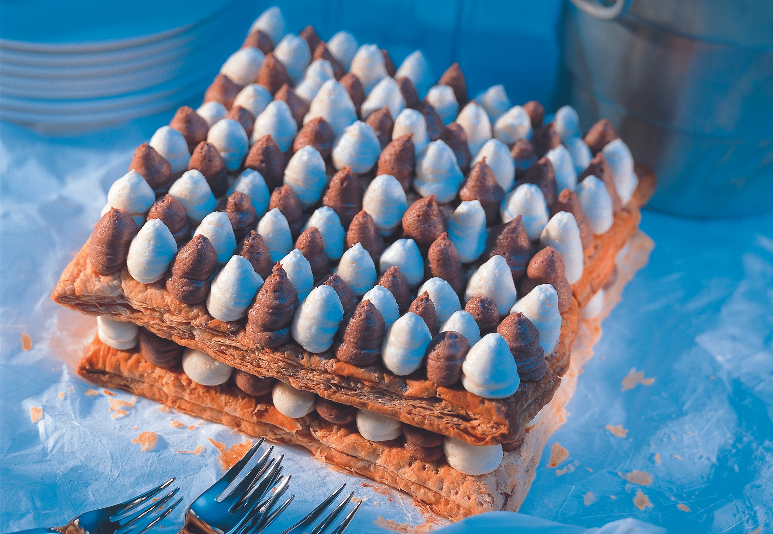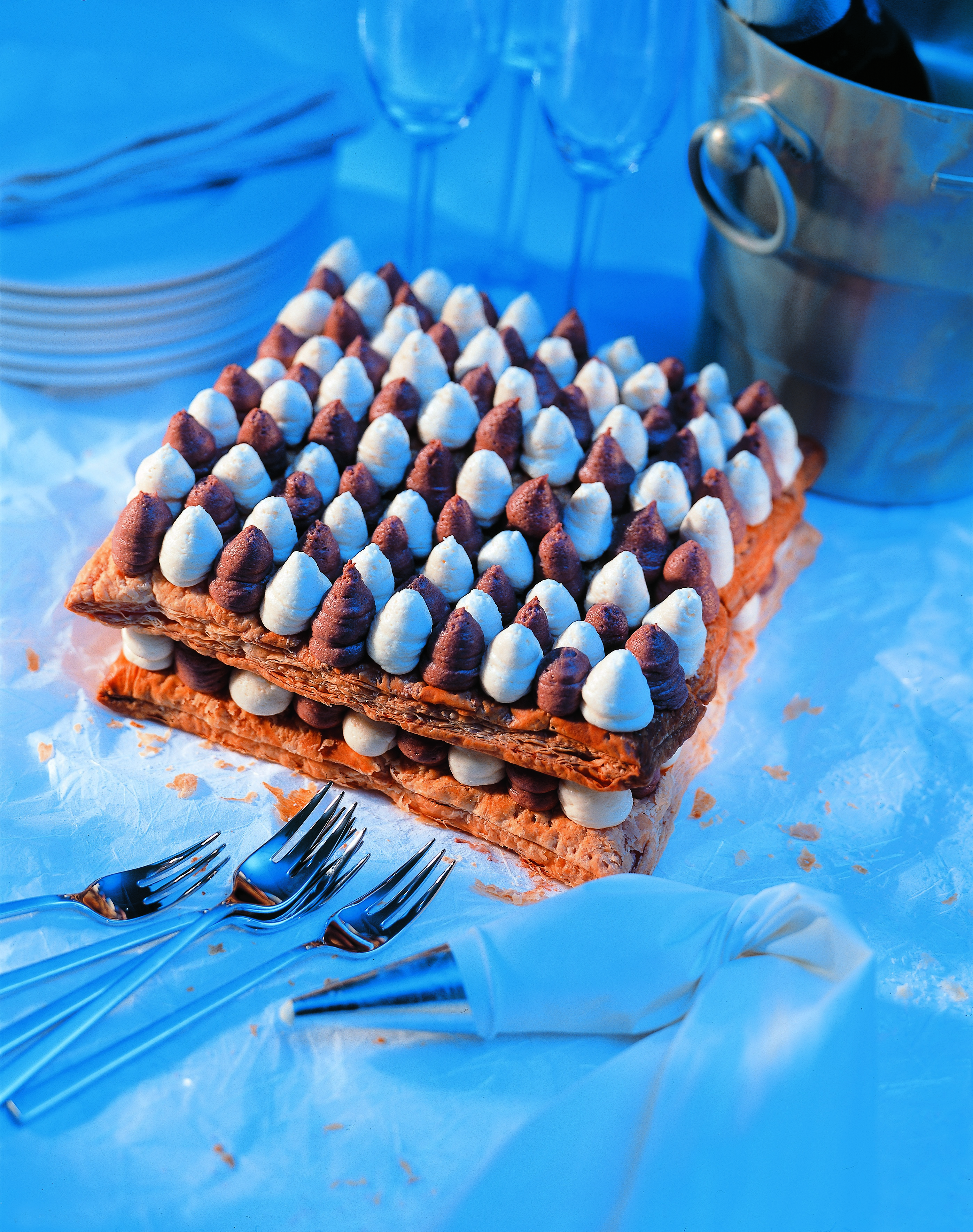 Die Hälfte der Creme mit Kakao einfärben. Die helle Creme in einen Dressiersack mit glatter Tülle (Ø 10 mm) füllen und Tupfer auf die beiden Teigplatten setzen, dann die dunkle Creme einfüllen und Tupfer dazwischen setzen (siehe Bild). Teigplatten ca. 30 Minuten kühl stellen, dann behutsam übereinander setzen und nochmals 30 Minuten kühlen.