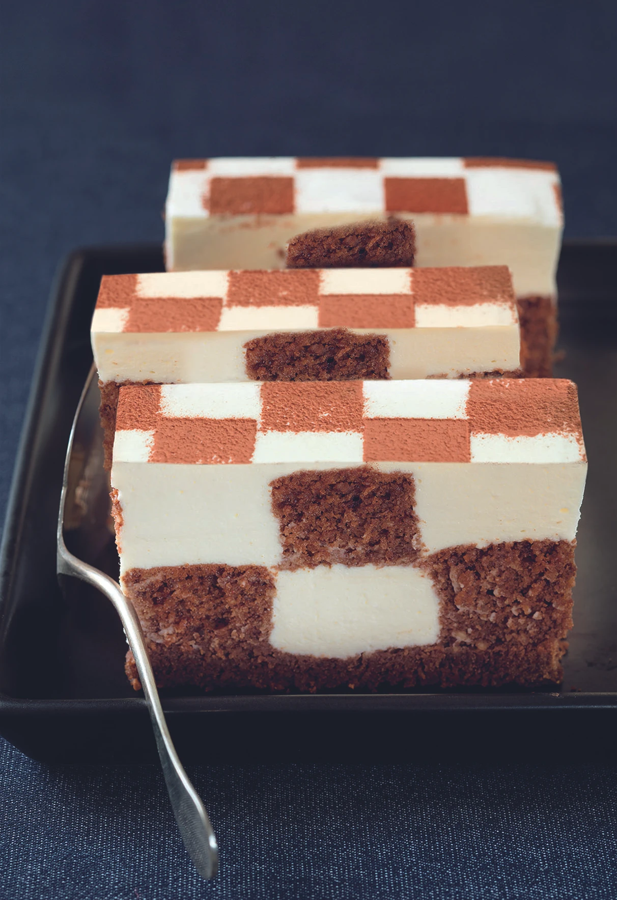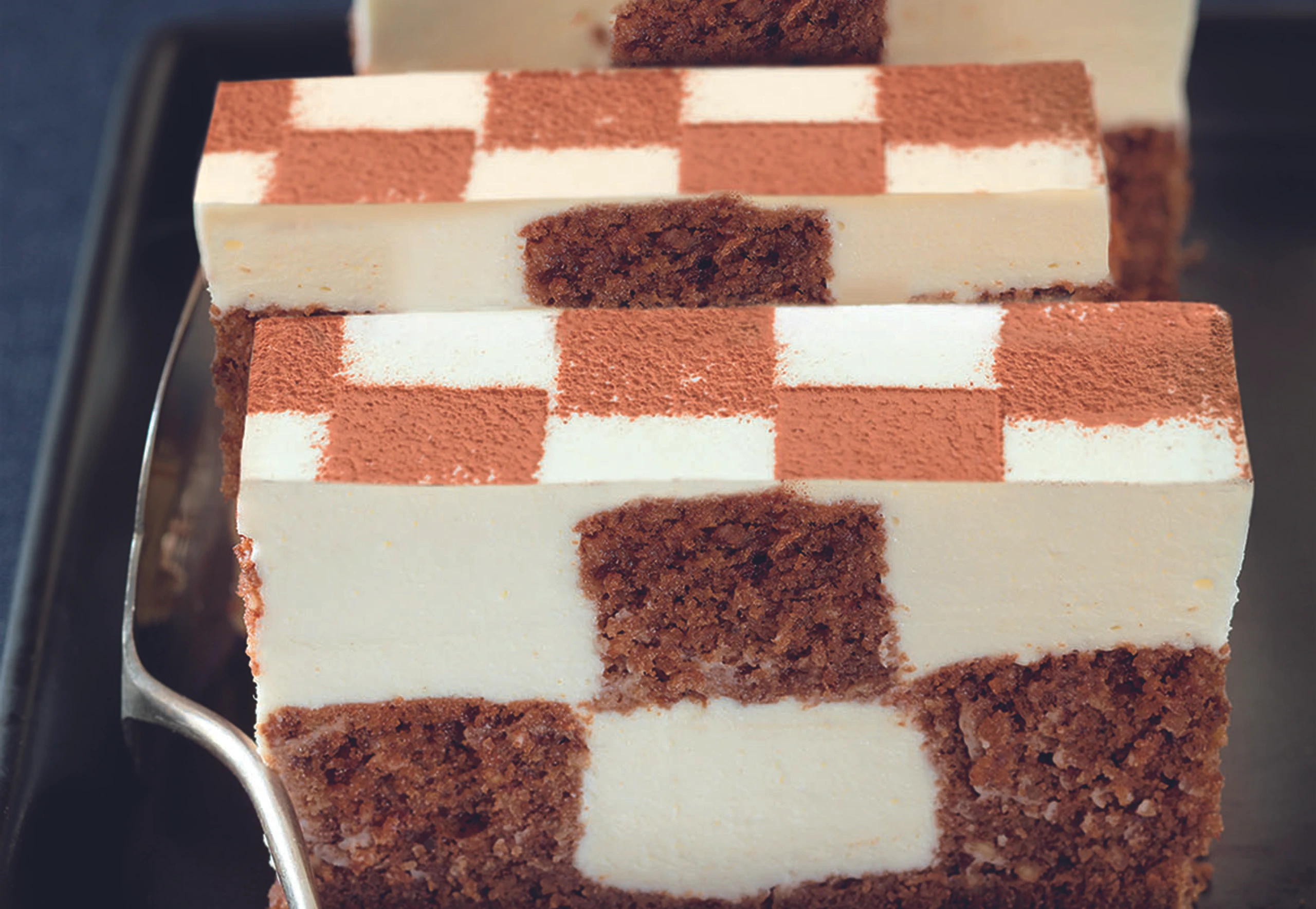 Kuchen aus der Form heben. Papierstreifen (2 cm breit) gitterförmig auf den Kuchen legen und mit Kakao bestreuen. Streifen behutsam abheben, säubern und versetzt nochmals gitterförmig auf den Kuchen legen. Entstandene freie Flächen mit Kakao bestreuen, so dass ein Schachbrettmuster entsteht.