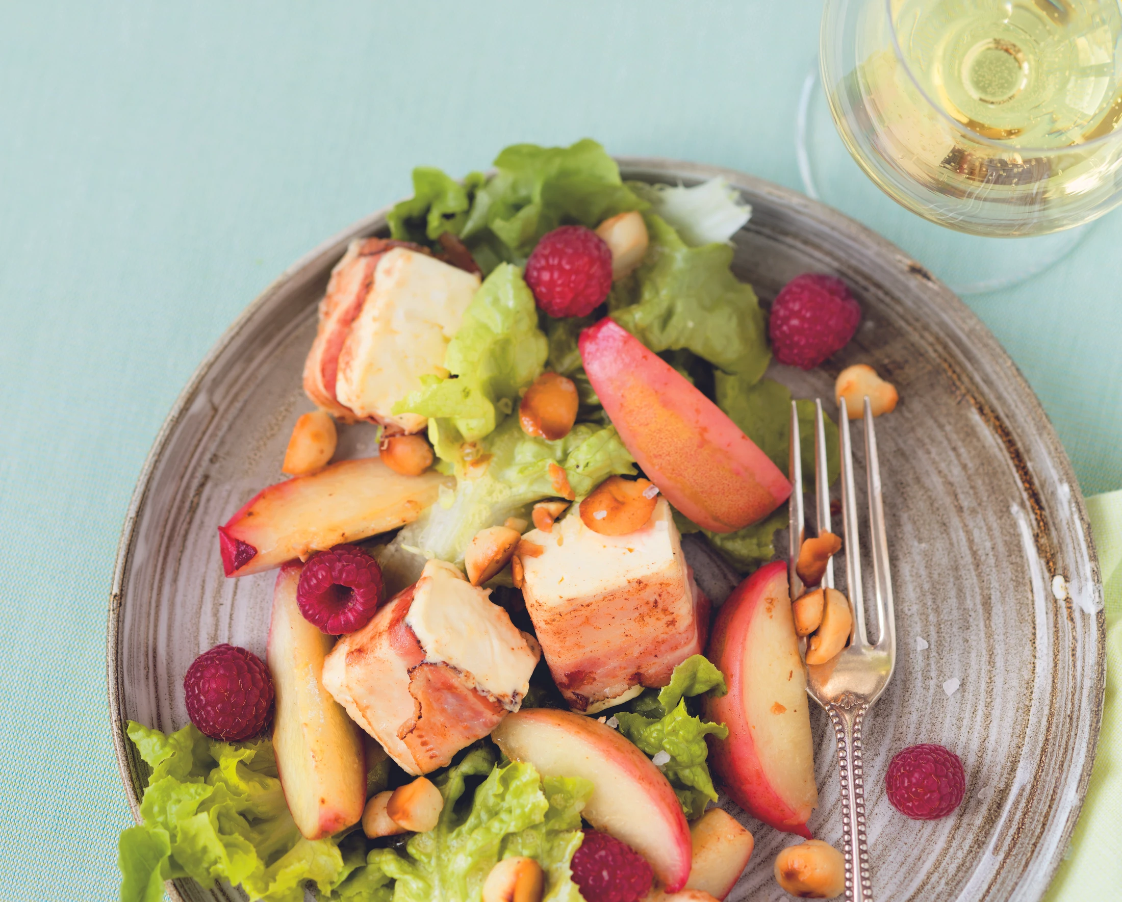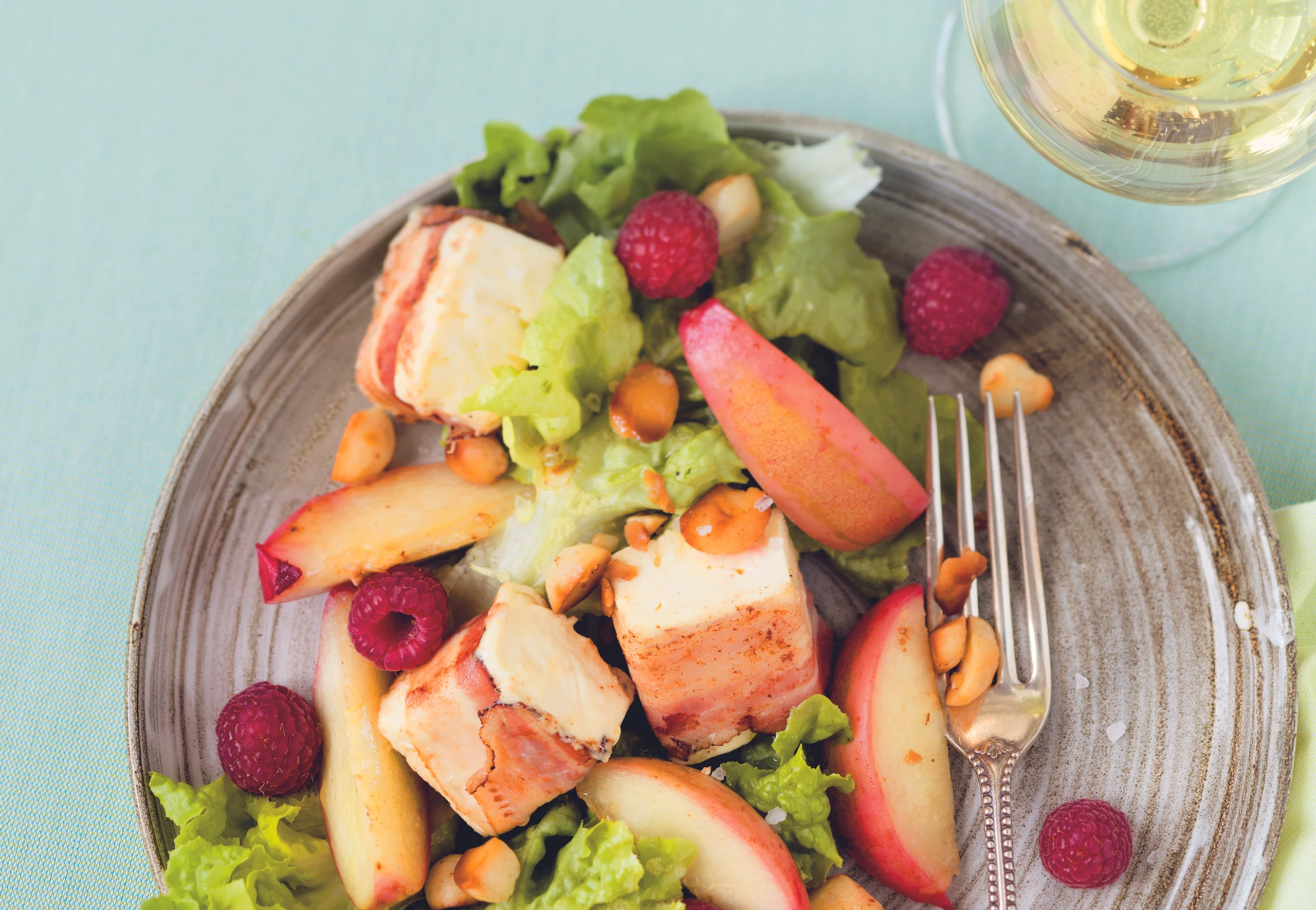 Schafkäse trockentupfen und in 8 gleich große Stücke schneiden. Käse salzen, pfeffern und mit je 1 Speckscheibe umwickeln. Pfirsichfruchtfleisch in Spalten vom Kern schneiden und mit dem Zitronensaft vermischen. Himbeeren verlesen. Macadamia in 1 EL Öl hell rösten und aus der Pfanne nehmen.