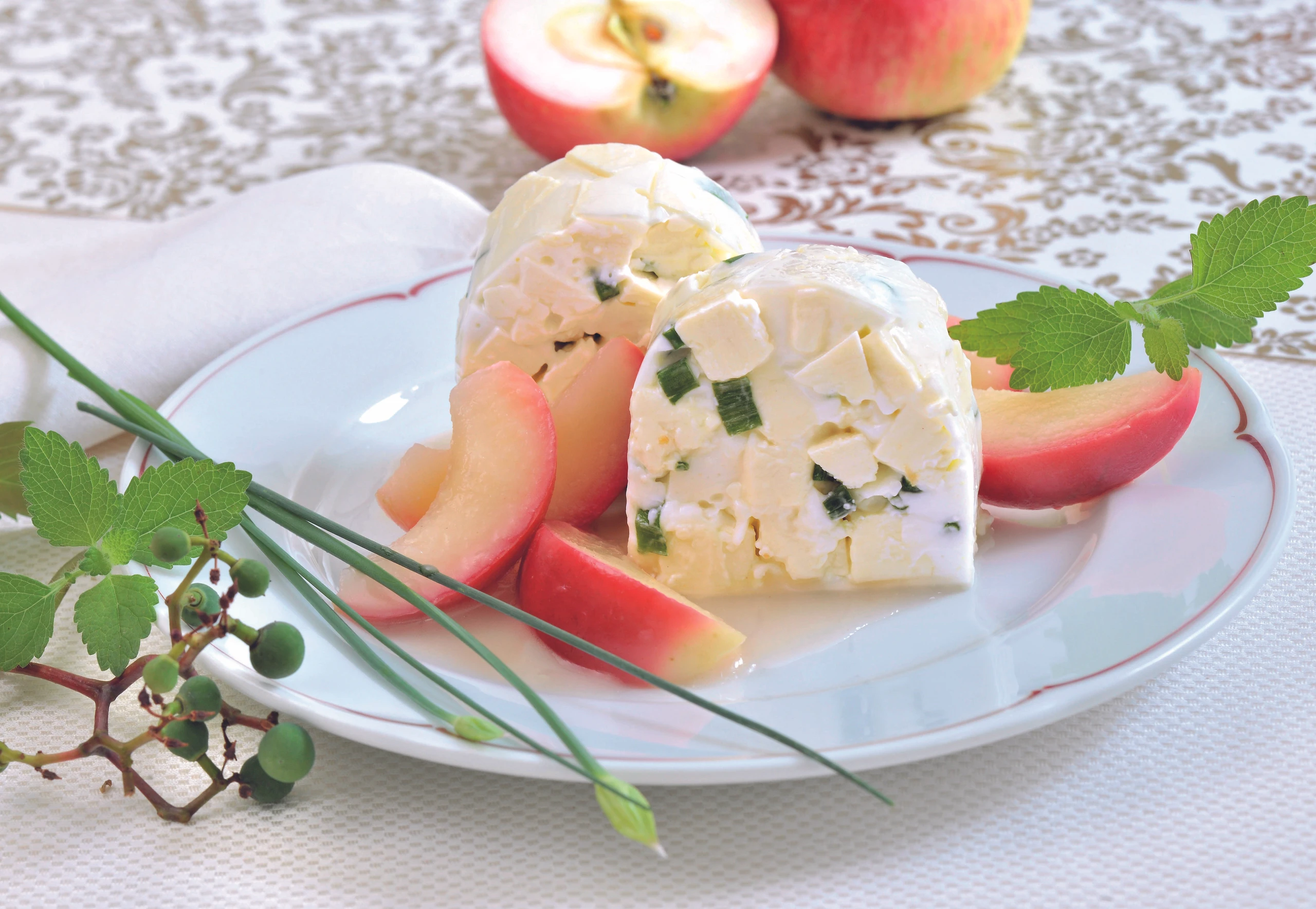 Gelatine in kaltem Wasser einweichen, gut ausdrücken und mit 3 EL vom Joghurt über Dampf schmelzen. Vom Dampf nehmen, übriges Joghurt, Schafkäse und Jungzwiebeln untermischen. Masse gleichmäßig in der Form verteilen, mit Frischhaltefolie zudecken und für ca. 5 Stunden kühl stellen.